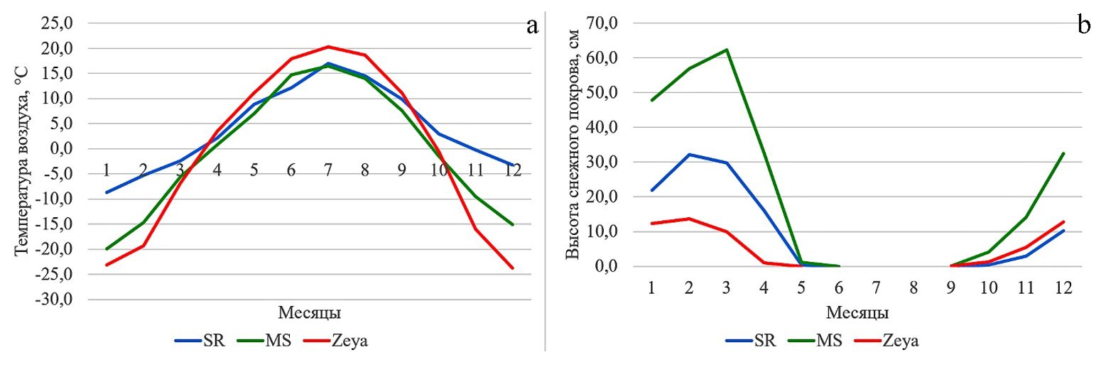 Рис. 3. Среднемесячные температура воздуха (a) и высота снежного покрова (b) за 5-летний период в районах северной границы распространения обыкновенного светляка. Обозначения: SR – метеостанция «Siikajoki Ruukki», центральная Финляндия, с 1 января 2014 г. по 31 декабря 2018 г. (https://clck.ru/35hm6P); MS – заповедник «Малая Сосьва», западная часть ХМАО – Югры, с 1 ноября 2013 г. по 31 октября 2018 г. [9-13]; Zeya – метеостанция «Зея», северная часть Амурской области, с 1 января 2014 г. по 31 декабря 2018 г. (https://rp5.ru)