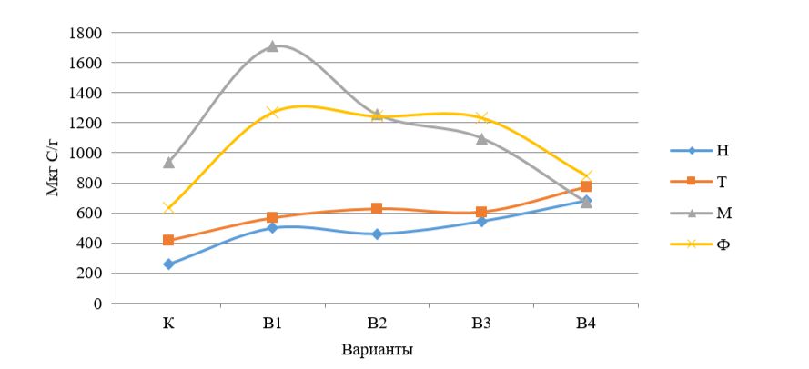 В отличие от опыта с технической рекультивацией, в опыте М максимальное содержание Смик была зарегистрировано в варианте с минимальной испытанной концентрацией поллютанта (В1), с последующим снижением значений Смик по мере увеличения содержания НП в почве. В вариантах В1–В3 опыта Ф содержание Смик имело близкие значения. В вариантах В4 во всех опытах концентрация Смик отличалась незначительно.