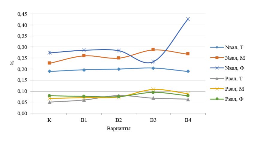 В вариантах опыта Т после инкубирования валовое содержание азота и фосфора в пробах практически не изменилось (рис. 2). Содержание Nвал в опытах с гранулятом было закономерно выше, чем без него. Причем в большинстве образцов после культивирования растений оно было выше, чем в опыте с микробиологической рекультивацией. Валовое содержание фосфора в опытах М и Ф после инкубации было выше, чем в опыте без гранулята.