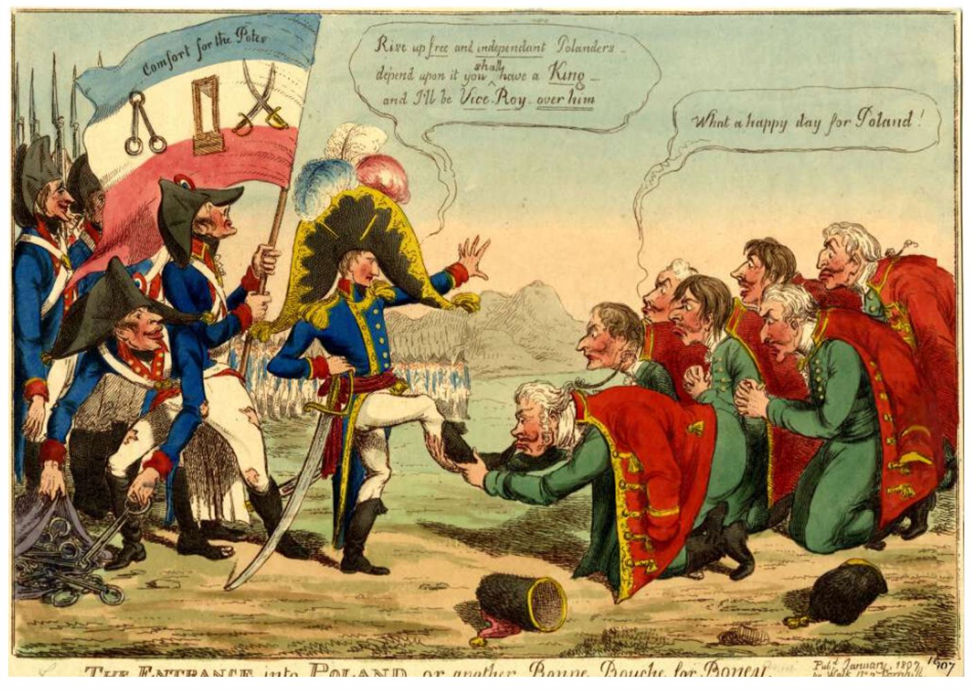 В ноябре 1806 года Наполеон со своей армией вошел в Польшу. Неизвестный художник изобразил это в карикатуре «Вход в Польшу или другой Бонн Буш для Бони» (рис. 9) [9]. Польские магнаты стоят на коленях и восклицают, целуя сапог Наполеона: «Какой счастливый день для Польши!». Наполеон в свою очередь высокомерно возвещает им о свободе и независимости поляков. Позади знаменосец несет флаг, на котором изображена пара оков, гильотина и два скрещенных меча с надписью «Комфорт для поляков». Рядом с ним другой французский солдат в рваной форме с насмешкой достает оковы из мешка.
