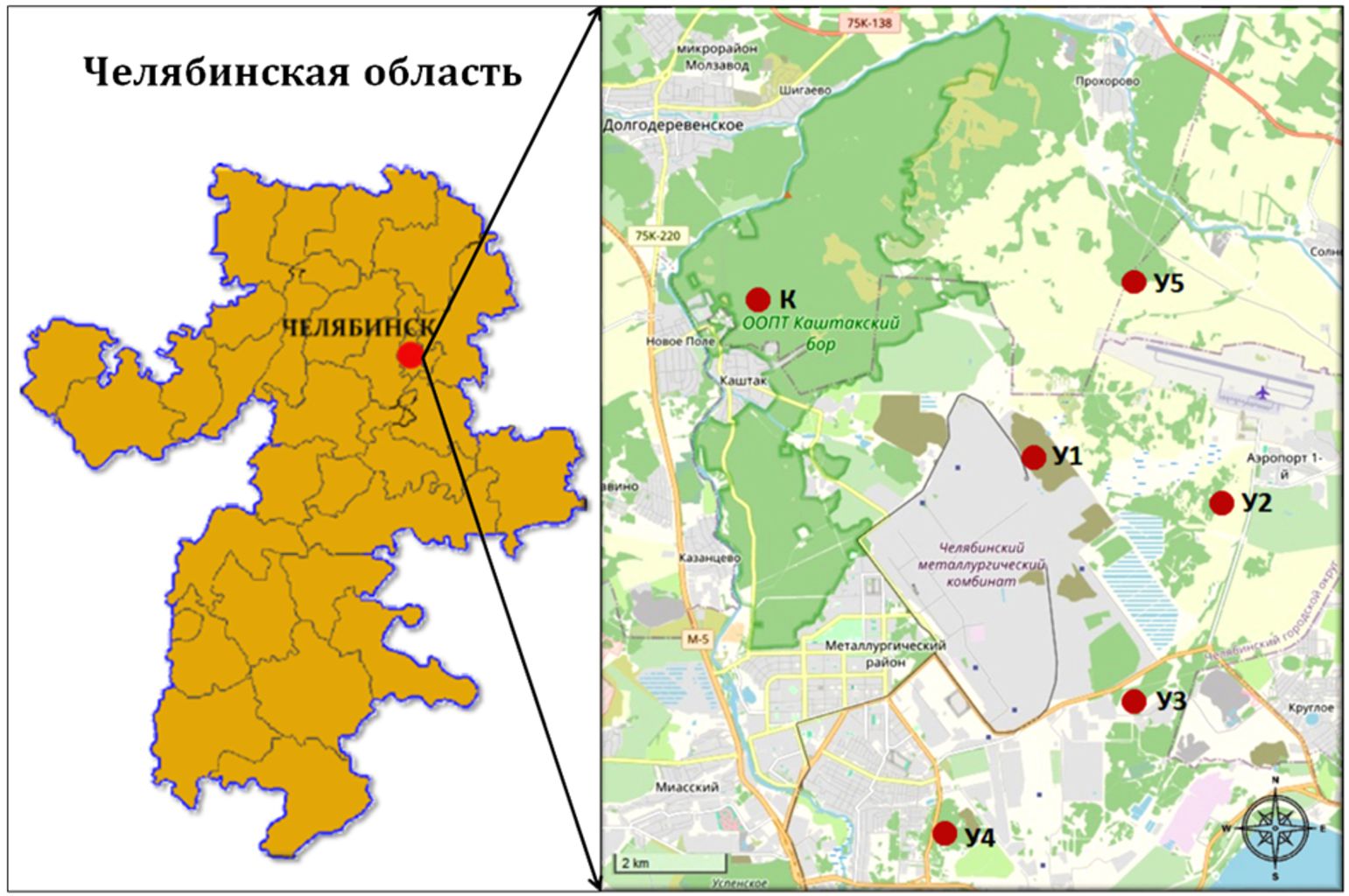Для достижения поставленной цели было выбрано шесть участков вблизи Челябинского металлургического комбината (ЧМК) и других сопутствующих предприятий производства стали и прокатных изделий, пять импактных: У1 – шлакоотвал, непосредственно прилегающий к ЧМК; У2 – дорога к Челябинскому аэропорту, около 3 км от ЧМК; У3 – дорога возле карьера, между ЧМК и Челябинским заводом стройиндустрии «Кемма»; У4 – дорога рядом с рекультивированной свалкой, около 4 км от ЧМК; У5 – грунтовая дорога за аэропортом, около 5 км от ЧМК; и один фоновый, К – северо-западная часть Каштакского бора (рис. 1). Каштакский бор, выбранный в качестве фонового участка с учетом розы ветров, является особо охраняемой природной территорией, расположенной на правом берегу реки Миасс, г. Челябинск [6]. По данным Росгидромета, в розе ветров этого города преобладают ветра южного, юго-западного и северо-западного направления, поэтому территория, на которой расположен бор, менее подвержена аэротехногенному воздействию.