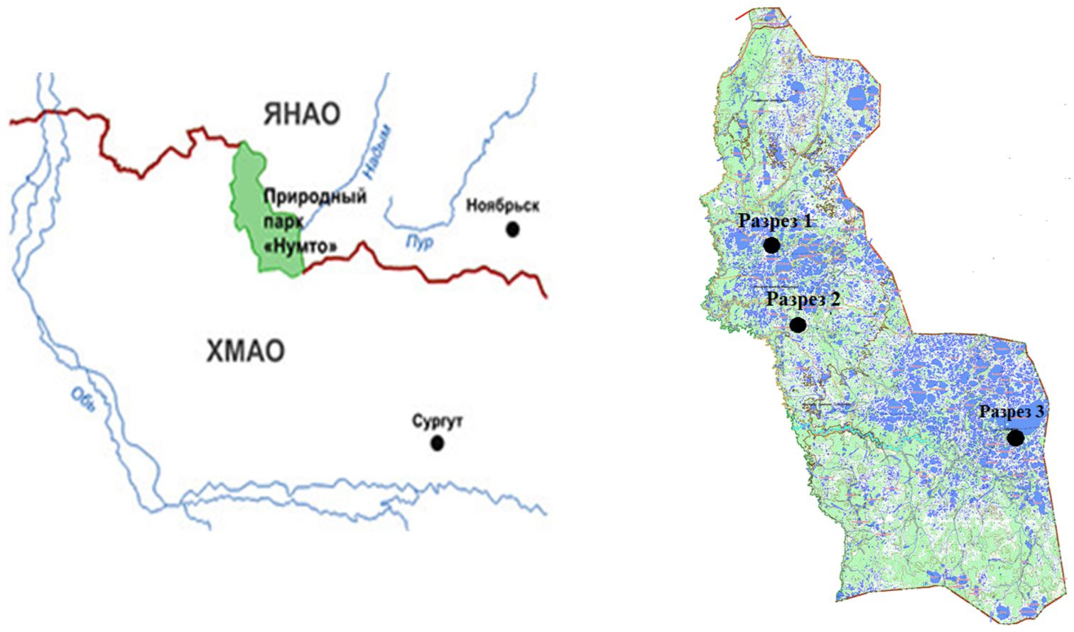 Материалы и методы исследования. Отбор проб торфа выполнен в летний период 2020–2021 гг. Территория исследования располагается в центральной части Западно–Сибирской равнины, на северном склоне возвышенности Сибирские Увалы между 63°10’–64°20’ с.ш., 70°00’ – 71°35’ в.д. По схеме районирования болотных систем [18] территория парка относится к Сургутско-Полесскому округу северотаежных олиготрофных озерково-грядово-мочажинных и сосново-кустарничково-сфагново-лишайниковых болот. Болота занимают примерно 2\3 территории парка «Нумто» [28]. Особенностью ландшафтов парка является широкое распространение мерзлых плоскобугристых болот с ерниково-кустарничково-лишайниковой растительностью, своеобразного анклава тундровых экосистем в таежной зоне [5]. Мерзлые торфяники здесь находятся вблизи южной границы распространения. По краям мерзлых торфяников распространены немерзлые сосново-кустарничково-сфагновые болота с разреженным древостоем высотой до 4–6 м. Широко распространены олиготрофные грядово-мочажинные и грядово-озерковые болота, с кустарничково-лишайниковыми сообществами с сосной на грядах и осоково-пушицево-сфагновыми в мочажинах. Мезотрофные осоково-моховые болота приурочены к приречным участкам.