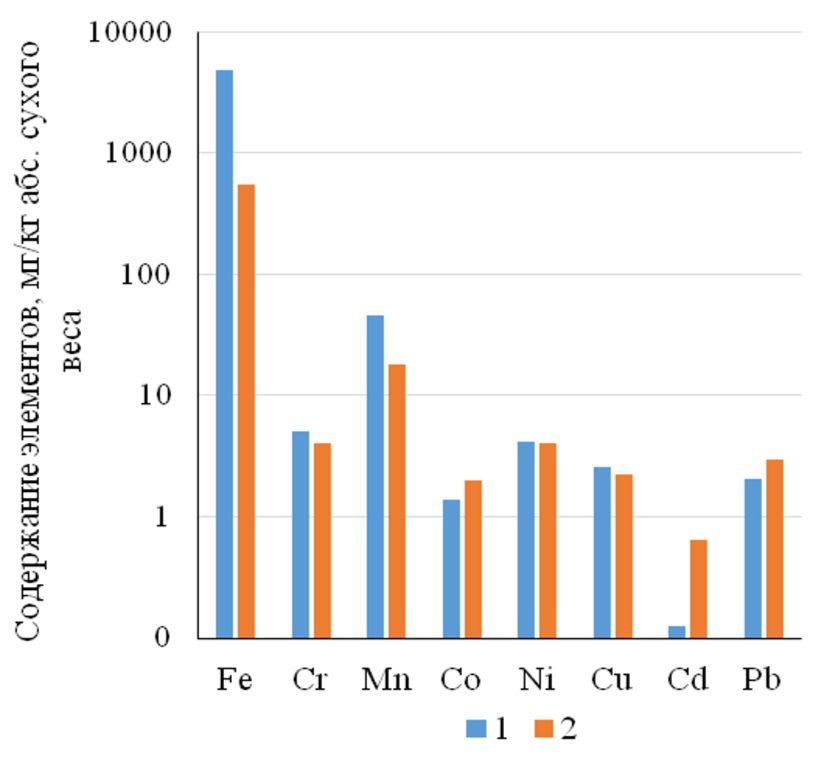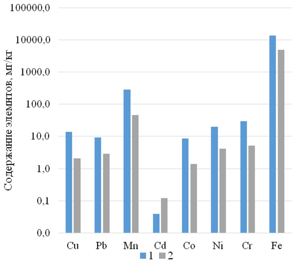 Рис. 5. Содержание 1 – тяжелых металлов в почвообразующих породах «Природного парка «Нумто» [5] и 2 – в торфе (наши данные)