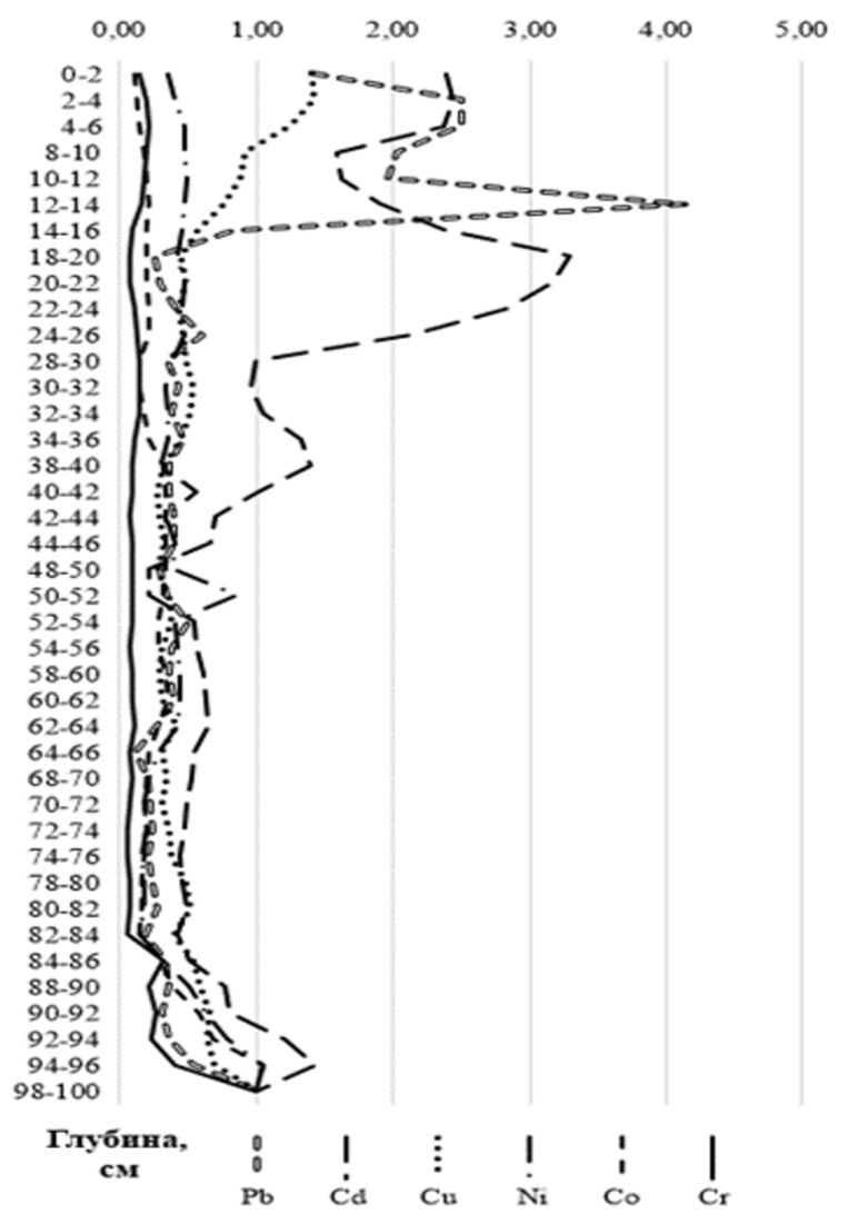 Вместе с тем содержание кадмия и свинца в исследованном торфе было на низком уровне. Свинец в исследуемых торфах аккумулируется в незначительных количествах: В исследованных разрезах его концентрация в 1,2–3,1 раз меньше средних значений для севера Западной Сибири по [26], содержание Cd меньше в 1,8–2,3 раза. Эти элементы традиционно считаются индикаторами антропогенного воздействия, обусловленного транспортной нагрузкой (Pb), цветной металлургией (Cd) [32]. Низкое содержание элементов в исследованных торфах можно объяснить их слабым поступлением от антропогенных источников вследствие удаленности от промышленных центров и в целом от крупных поселений.