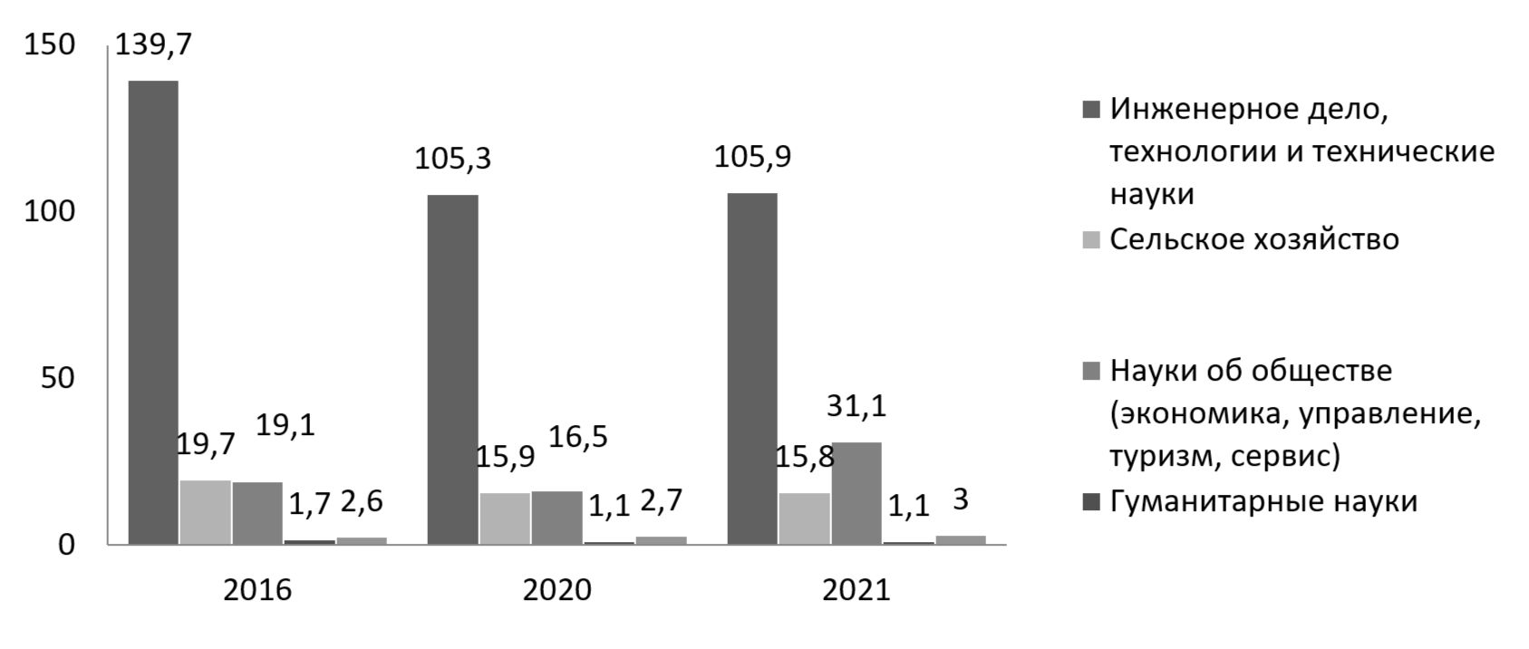 Еще одним очень важным моментом для понимания перспектив обеспечения кадрами решения задачи Стратегии по наращиванию потенциала для технологического суверенитета страны является то, что более востребованными специальностями в СПО становятся «сервисные»: торговля, туризм, гостиничный бизнес, дизайн, парикмахерское дело, повара, строительство и пр. [21, c. 21]. Представим данные по укрупненным группам профессий на приведенном ниже рисунке. К сожалению, более детально можно увидеть рост по направлению «науки об обществе», но подготовка плиточников, каменщиков и пр., тех, кто впоследствии уходит в область частного строительства, входит в раздел «инженерное дело» (рис. 2).