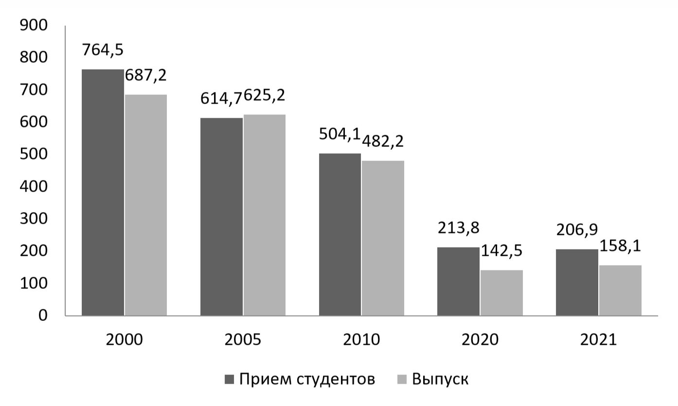 Можно было бы в качестве контраргумента привести причины недостаточности материально-технической базы в периферийных регионах для качественной подготовки по данным специальностям или сокращение количества поступающих как последствие демографической ямы 90-х гг. Последний фактор привел к сокращению доли молодежи (18–24 лет) с 2010 по 2020 г. на 40% – c 16172 тыс. чел. до 9617 тыс. чел. (https://clck.ru/3DAFhA). К этому добавляется переориентация интереса поступающих на профессии, которые могут дать основу для ведения собственного бизнеса, и мы получаем объяснение, почему за последнее десятилетие выпуск по программам ППКРС уменьшился на 72,4% – 572,1 тыс. чел. в 2010 г. и 158,1 тыс. чел. в 2021 г. (https://clck.ru/3DAFn4) (рис. 3).