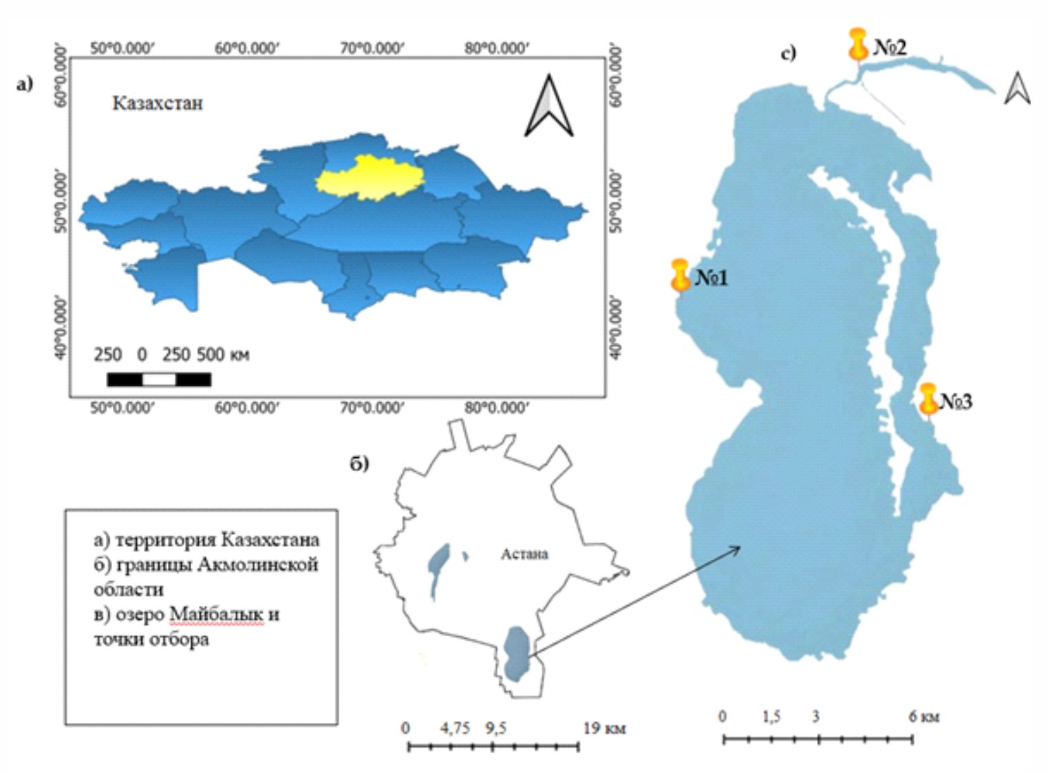 Отбор проб воды для изучения морфометрических и гидробиологических показателей озера проводили в июне-июле 2020 и 2021 гг. согласно известным методам в гидробиологической практике [11]. Координаты точек отбора проб (рисунок 1): точка 1 – на территории бывшего рыбопитомника «Мaybalyk» (51°00'11.4''N, 71°28'30.3''E); точка 2 – заводь, со стороны заброшенной фермы (51°01'46.2''N, 71°30'31.1''E); точка 3 – место разрешённой рыбалки (50°59'30.1''N, 71°31'30.9''E).