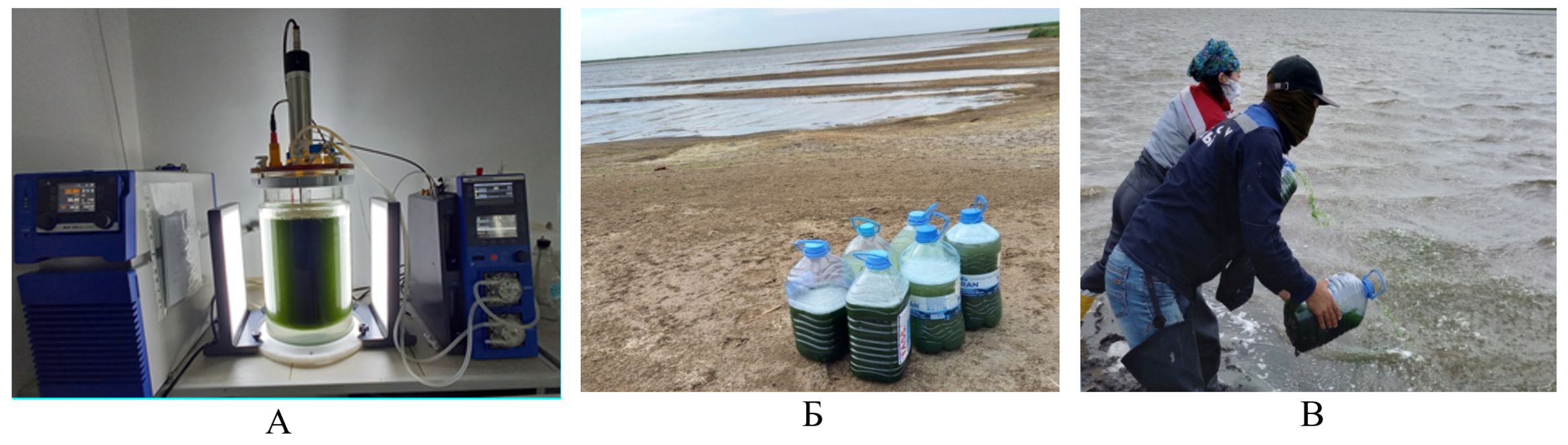 Для изучения действия и определения эффективности применения микроводорослей в 2021 г. проведена альголизация озера Майбалык консорциумом, сформированном из двух аборигенных штаммов Parachlorella kessleri (Fott & Nováková) Krienitz, 2004) У1 и Chlorella vulgaris (Beijerinck, 1890) И2 (далее У1+И2). Согласно ранее проведенным лабораторным исследованиям, штамм P. kessleri У1 обладает высокой способностью к аккумуляции биогенных элементов и главных ионов [15], тогда как штамм C. vulgaris И2 демонстрирует эффективность в аккумуляции тяжёлых металлов, таких как медь, цинк, железо и марганец [16]. Учитывая эти свойства, было принято решение о внесении ассоциации данных штаммов в виде консорциума У1+И2 в исследуемый водоём. Для подготовки консорциума биомасса была предварительно наработана в лабораторном фотобиореакторе общим объемом 30 л с плотностью суспензии 20±106 кл/мл. Внесение консорциума осуществлялось вручную в 3-х точек озера Майбалык однократно в июне месяце при температуре воды 22 °С. Суспензию микроводорослей разливали на расстоянии 5–10 м и 15–20 м от берега с расчетом 2 л/га. На рисунке 2 представлен процесс внесения консорциума микроводорослей У1+И2 в озеро Майбалык.