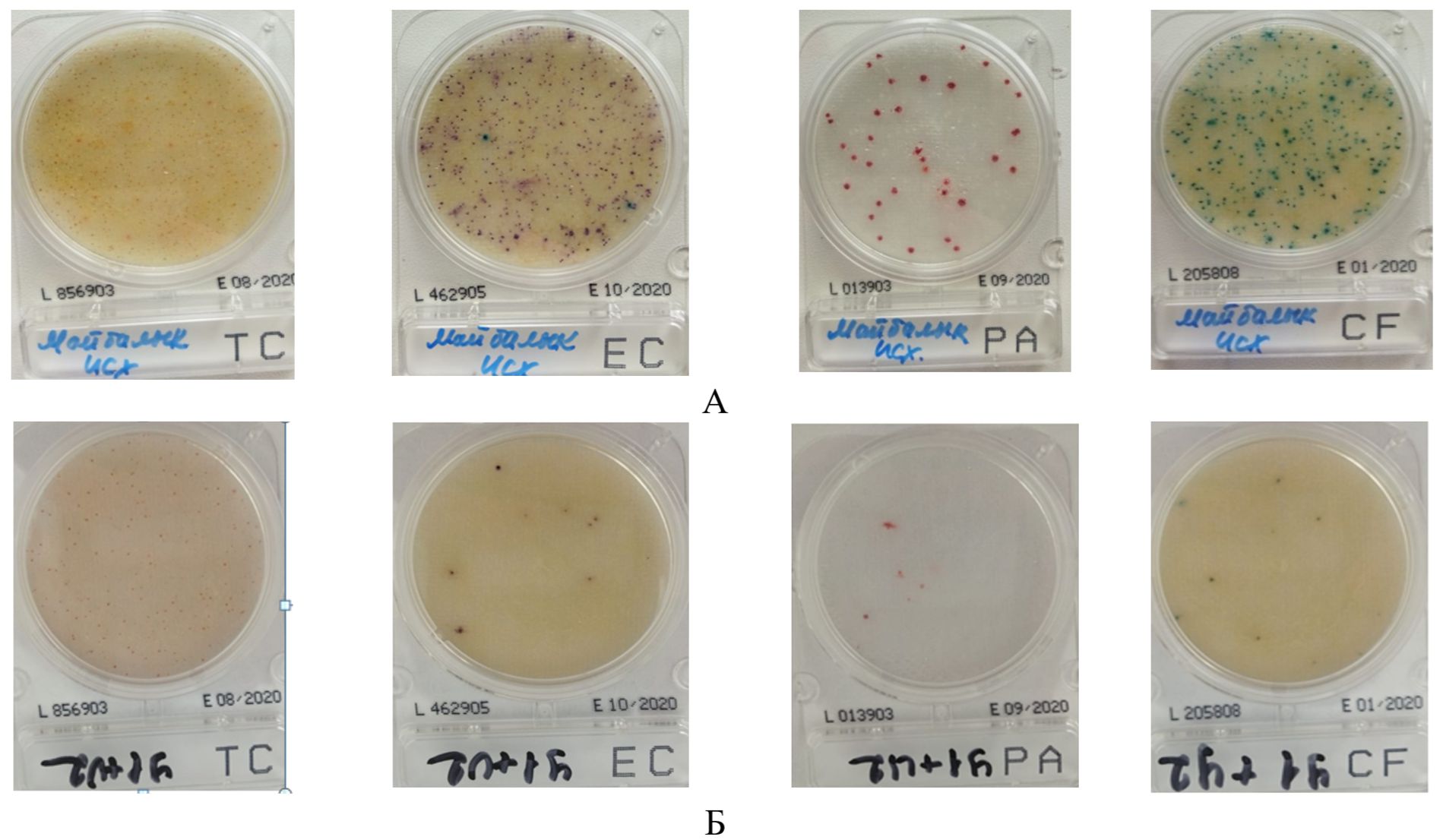 Микробиологический анализ воды озера Майбалык проводили в исходных образцах воды (до альголизации) и через 30 суток после обработки консорциума на основе ассоциации микроводорослей с помощью хромогенных селективных сред Compact Dry (Nissui Pharmaceutical Co. Ltd., Япония, предназначенные для определения и подсчета основных физиологических групп микроорганизмов: ТC (для выявления общего микробного числа, ОМЧ); EC (для выявления кишечной палочки и колиформных бактерий); YMR (для выявления дрожжей и грибов); X-SA (для выявления золотистого стафилококка); X-BC (для выявления восковой бациллы); ETC (для выявления энтерококка); ETB (для выявления энтеробактерий); CF (для выявления колиформных бактерий); SL (для выявления сальмонелл); AQ (для выявления гетеротрофов). Для этого методом предельных разведений был сделан высев исследуемых образцов воды объемом 1 мл на поверхность готовых пластин Compact Dry. Чашки инкубировали согласно инструкции изготовителя в диапазоне от 28°С до 43°С в течение 1–3 суток для каждого вида микроорганизмов при аэробных условиях.