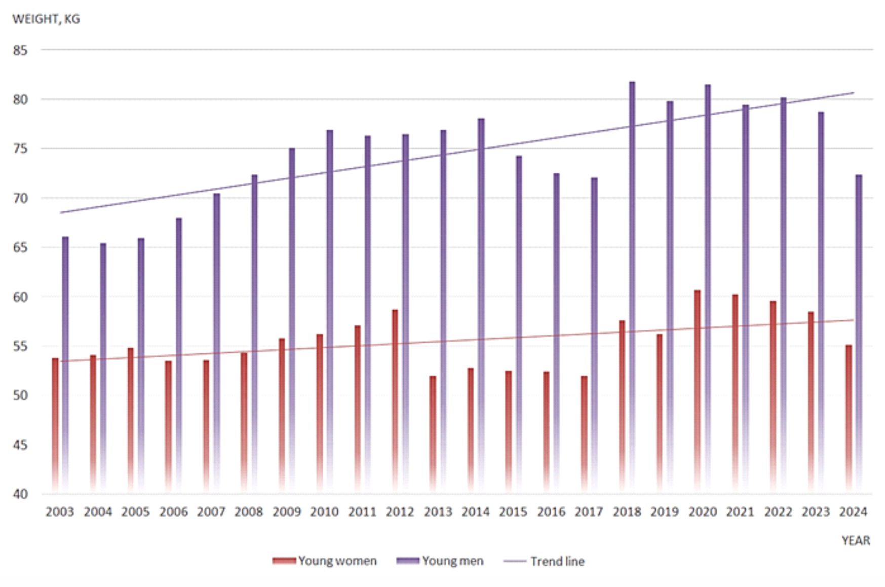 The survey revealed statistically significant differences in growth rates among young women in 2024 (165.9±5.6 cm) compared to 2003 (159.2±2.4 cm), 2004 (160.4±2.7 cm), 2005 (159.3±2.6 cm), 2006 (160.8±2.9 cm), 2007 (161.5±2.8 cm), 2008 (162.0±2.5 cm), 2012 (169.3±2.1 cm), 2013 (168.9±2.5 cm), 2016 (162.5±2.4 cm), 2017 (160.7±2.3 cm), as well as 2022 (168.2±2.3 cm). Despite the fact that according to the measurement results, in 2012, 2013 also in 2022, the weight of young women was greater than in 2024, the trend line as a whole demonstrates the growing dynamics of this indicator over the past 22 years (Fig. 1).