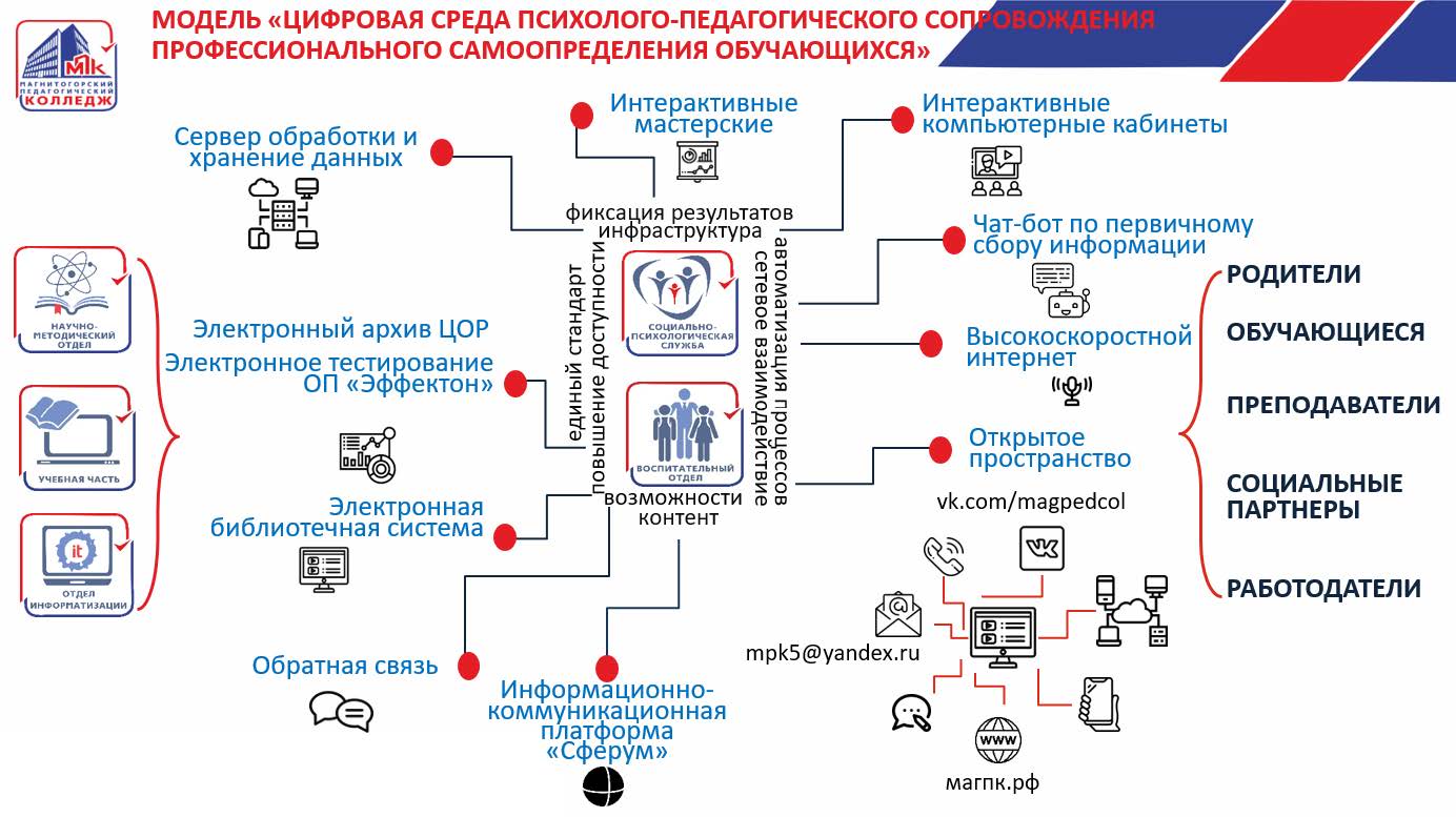 - Разработанная цифровая среда обеспечивает реализацию открытого коммуникативного пространства для обучающихся, родителей, преподавателей, социальных партнеров и работодателей, что способствует организации и реализации целенаправленной работы по профессиональному самоопределению обучающихся на базе Магнитогорского педагогического колледжа.