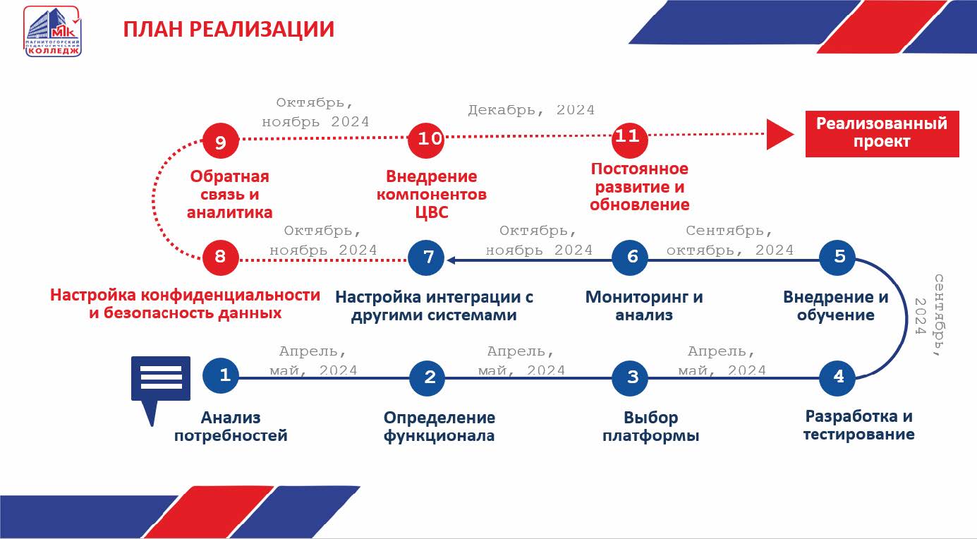 Разработка и реализация цифровой среды психолого-педагогического сопровождения профессионального самоопределения обучающихся происходила в течении 2024 года. На первом этапе был проведен анализ потребностей всех субъектов реализации цифровой среды, определен функционал сотрудников, принимавших участие в разработке, был произведен выбор платформы, на котором данная среда будет реализована. Второй этап связан с разработкой и тестированием цифровой среды, ее внедрением в образовательный процесс, апробацией пользователями, интеграцией в цифровую образовательную среду колледжа. Третий этап реализации цифровой среды связан с настройкой конфиденциальности и безопасности данных, анализом полученной обратной связи, постоянным развитием и обновлением ее содержания.