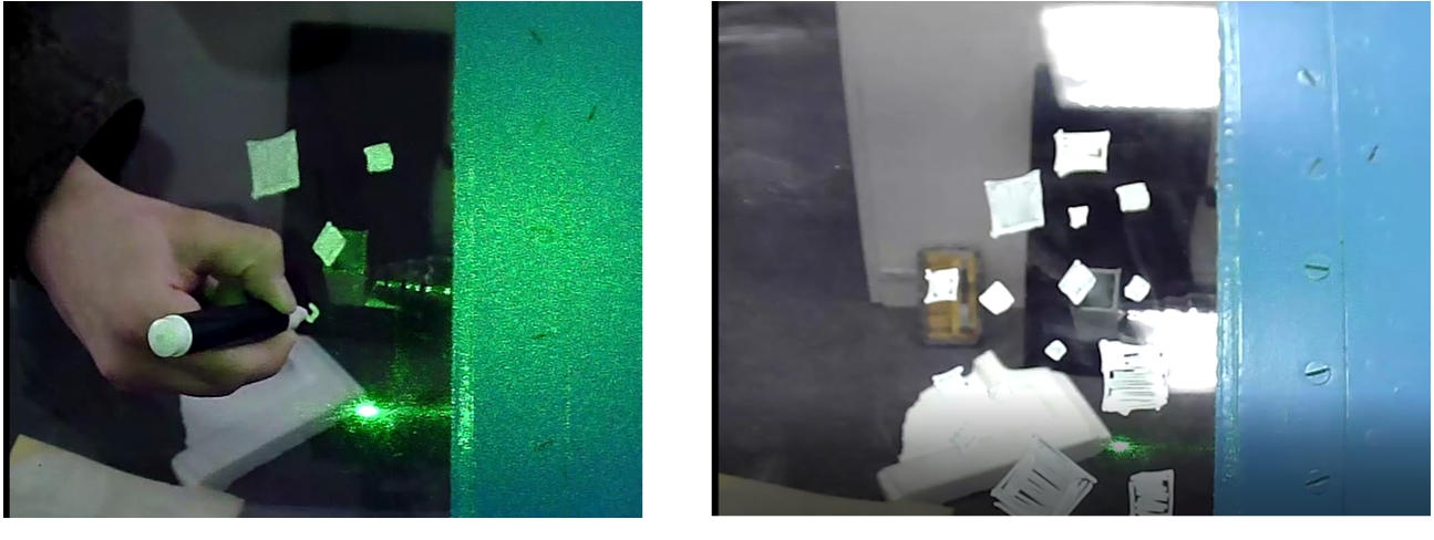 Обучение нейросети осуществлялось по 20000 различным изображениям контрольных меток, нанесенных вручную меловым маркером на поверхности остекления кабины самолета под различным ракурсом, с разной мощностью облучения лазера и различной внешней фоновой обстановкой (рис. 5). Данные изображения были использованы как обучающая выборка данных.