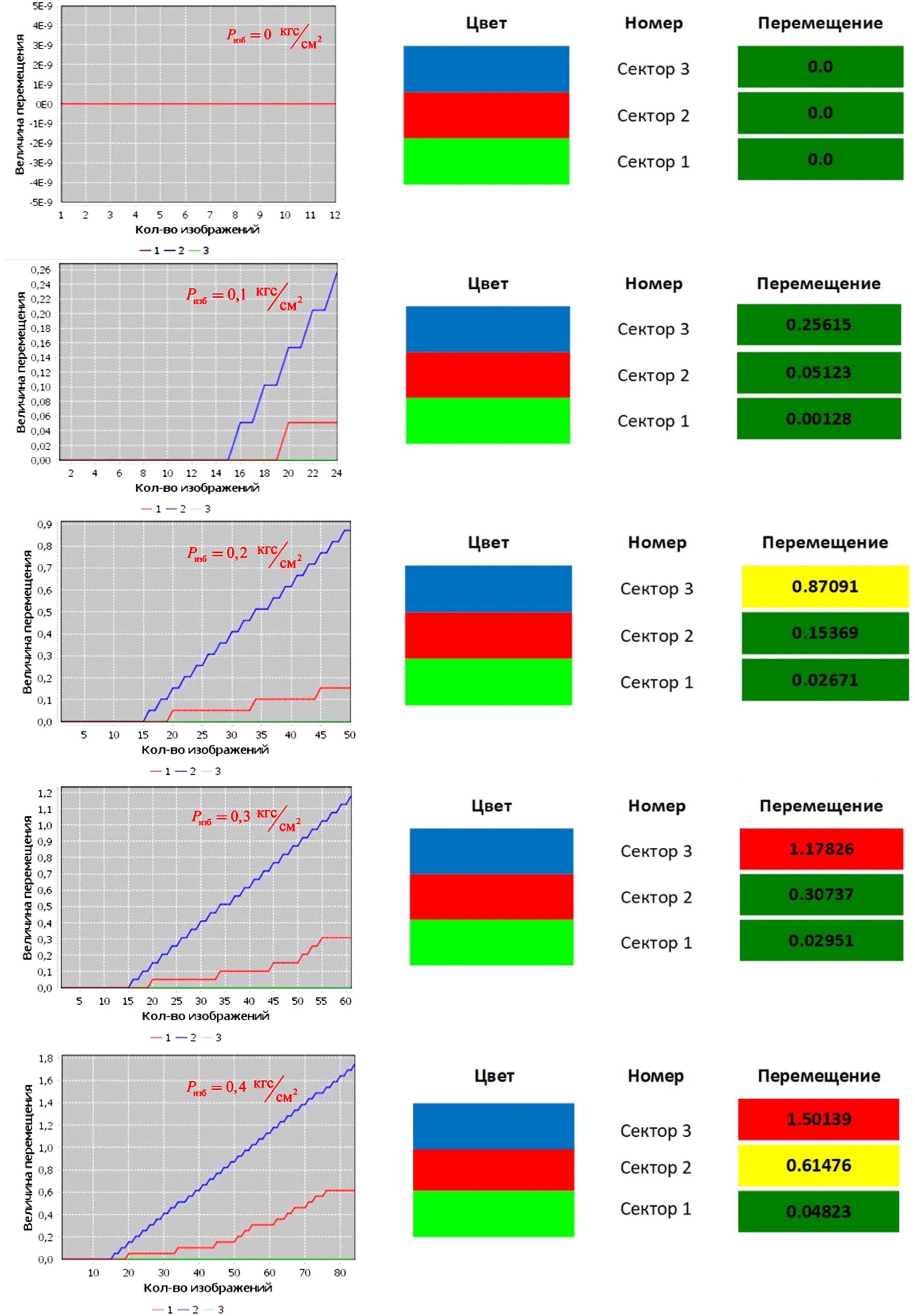 По команде оператора одновременно с повышением избыточного давления внутри кабины до 0,4 кгс/см2 происходит регистрация спекл-полей и расчет величины выхода остекления из заделки. При этом одновременно на секторе 6 и панели 7 отображается информация о расчете величины выхода остекления на трех контролируемых участках как в графическом, так и в числовом значении (см. рис. 10), кроме этого, поле, в котором отображается числовое значение величины выхода остекления из заделки, подкрашивается соответствующим цветом: «зеленый» – норма; «желтый» – опасно; «красный» – критически опасно (недопустимо). Верификация результатов испытаний разработанного программного модуля с результатами, полученными в ходе оценки технического состояния кабины «ленточным» методом, показало, что погрешность полученных результатов на 20% больше, чем у «ленточного».