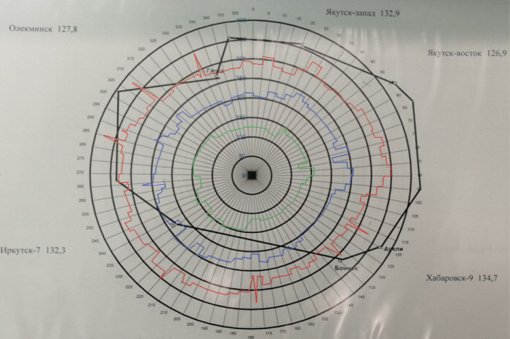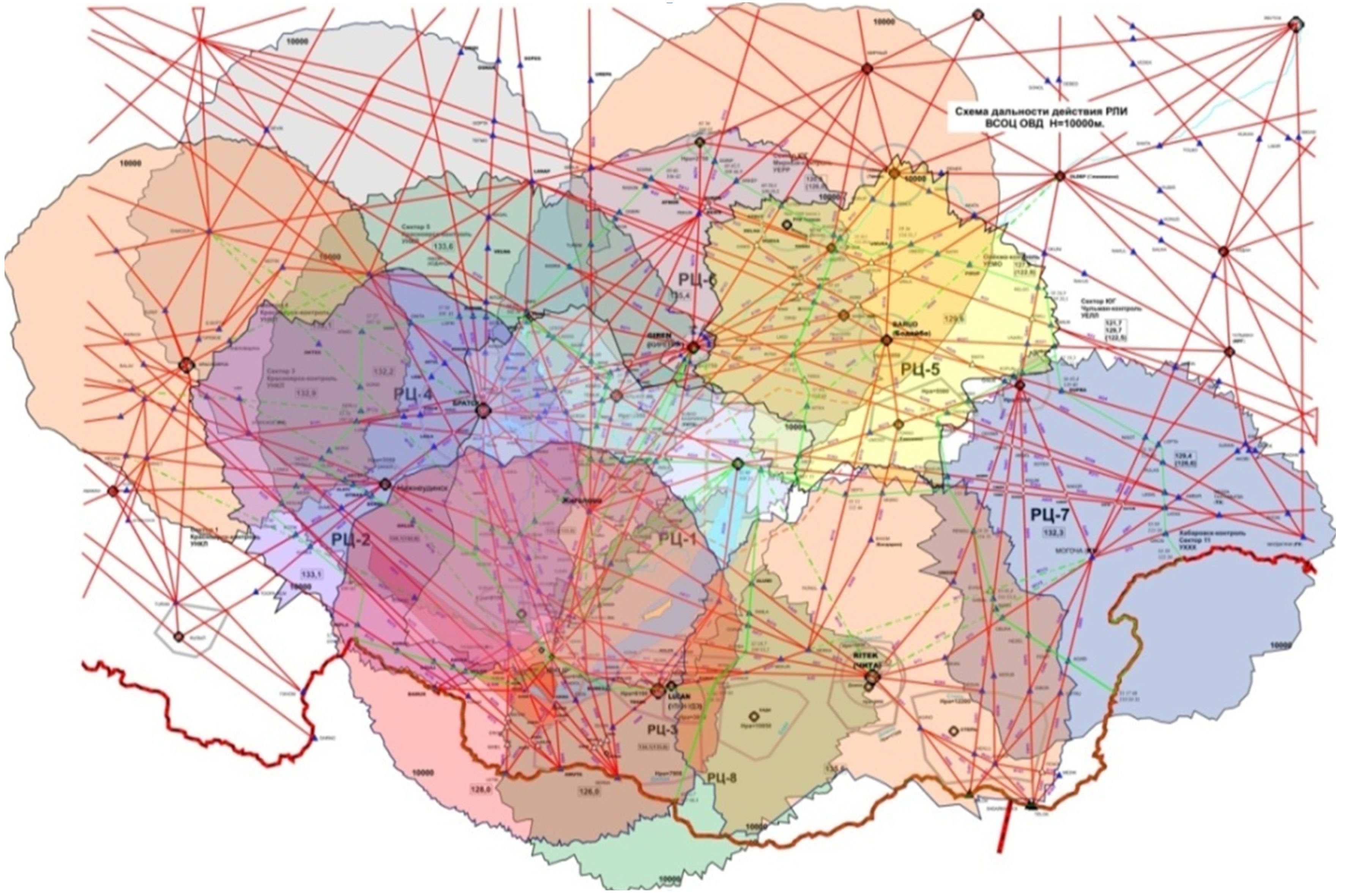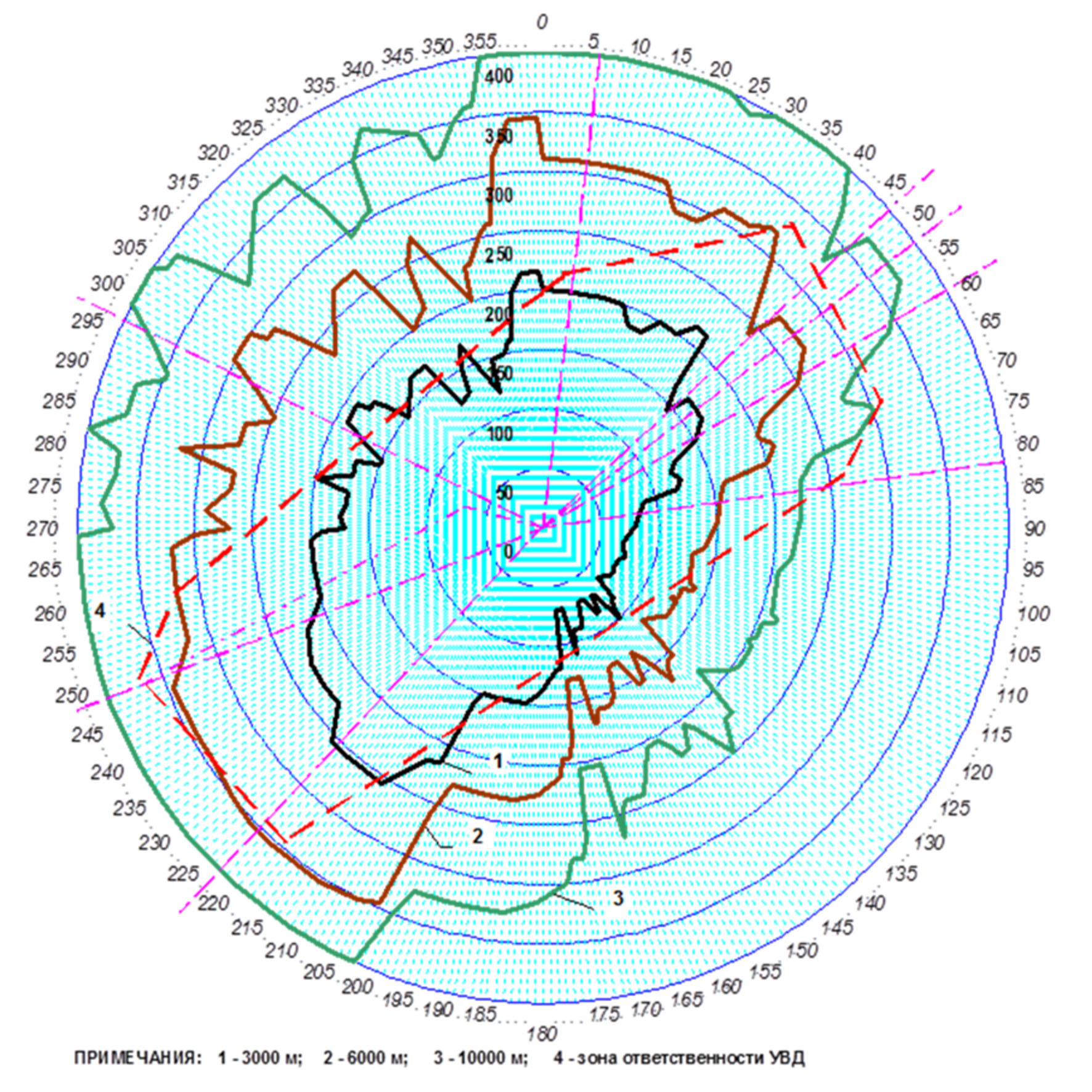 Красными пунктирными линиями на окружности обозначена зона ответственности УВД. Зеленым, красным, черным цветами обозначена зона видимости в зависимости от высоты полета ВС. Из графика видно, что средства наблюдения, установленные на позиции п. Чайбуха, вполне обеспечивают полное радиолокационное перекрытие зоны ответственности УВД.