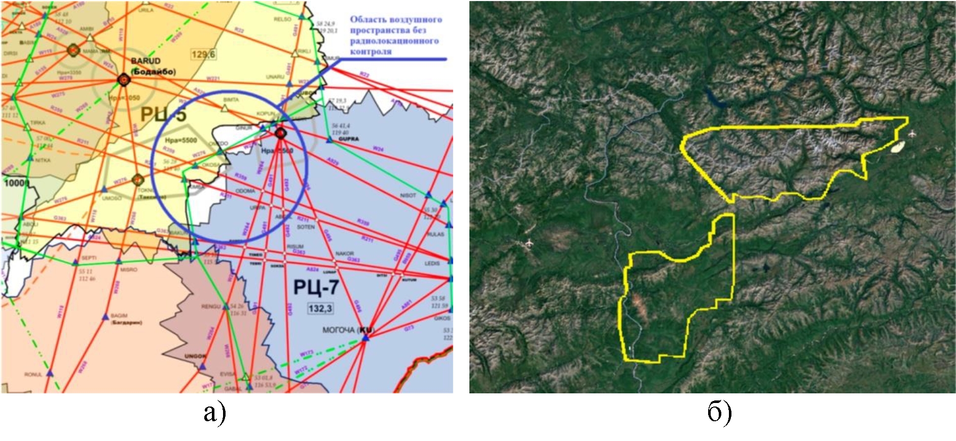 Рисунок 2 – Области воздушного пространства, где отсутствует радиолокационное наблюдение: а) навигационная карта; б) географическая карта