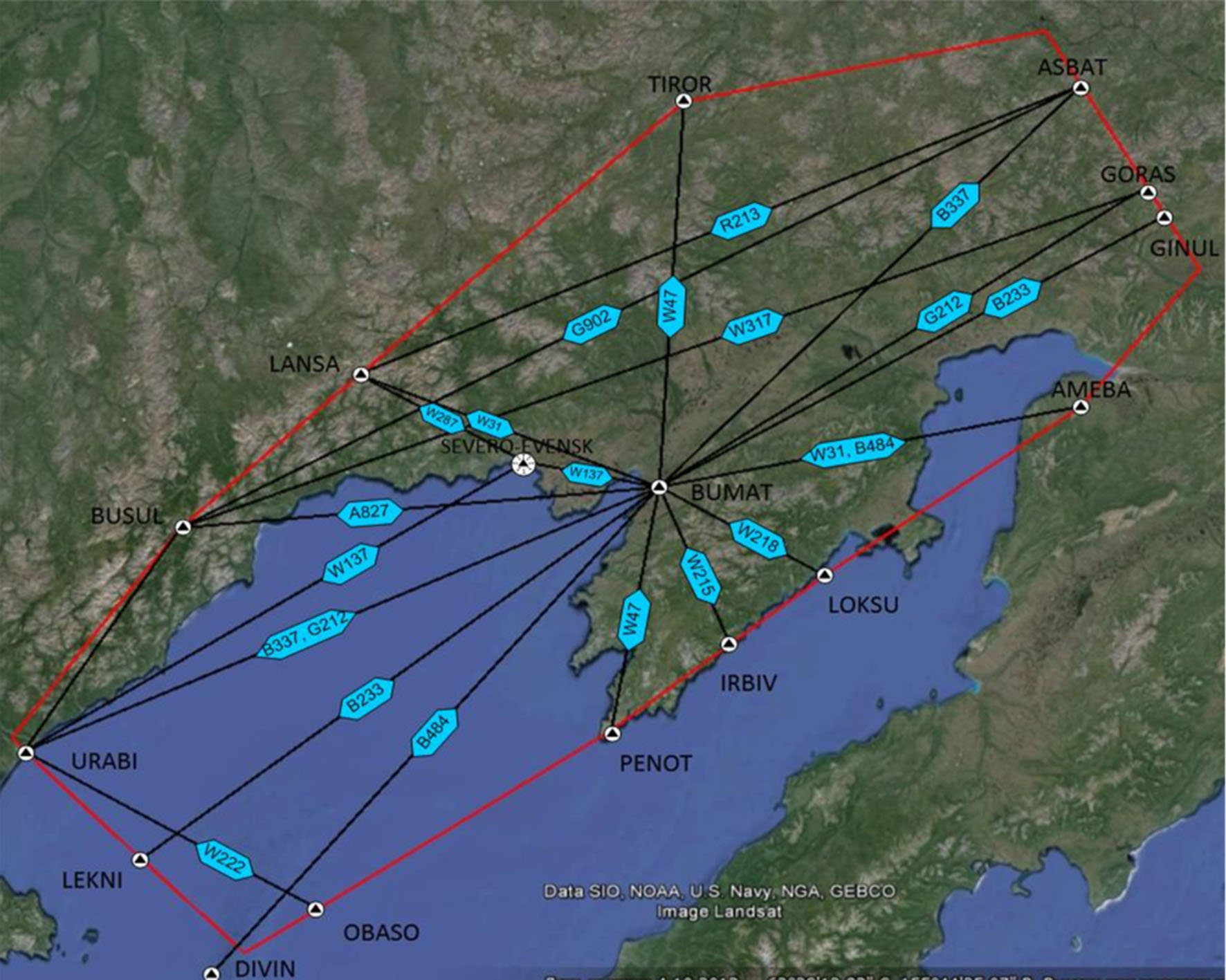 В связи с этим стоит оценить необходимость применения МПСН для построения новых оптимальных маршрутов и воздушных трасс, где реализуется функция наблюдения, для сокращения интервалов движения и повышения качества управления воздушным движением. Реализуемый службой движения лозунг «Слышу, Вижу, Управляю» содержит составляющую, требующую необходимости визуализации пространственного положения ВС, находящихся под управлением, на рабочем месте диспетчера, в реальном времени и во всей зоне ответственности регионального центра. В данной работе анализу были подвергнуты три области пространства, в которых выполняются полеты по приборам (по воздушным трассам), имеющие особый интерес с точки зрения оптимального построения траекторий и имеющие большую географическую площадь. Такими областями явились: Иркутский, Нерюнгринский и Магаданский региональные центры ОрВД.