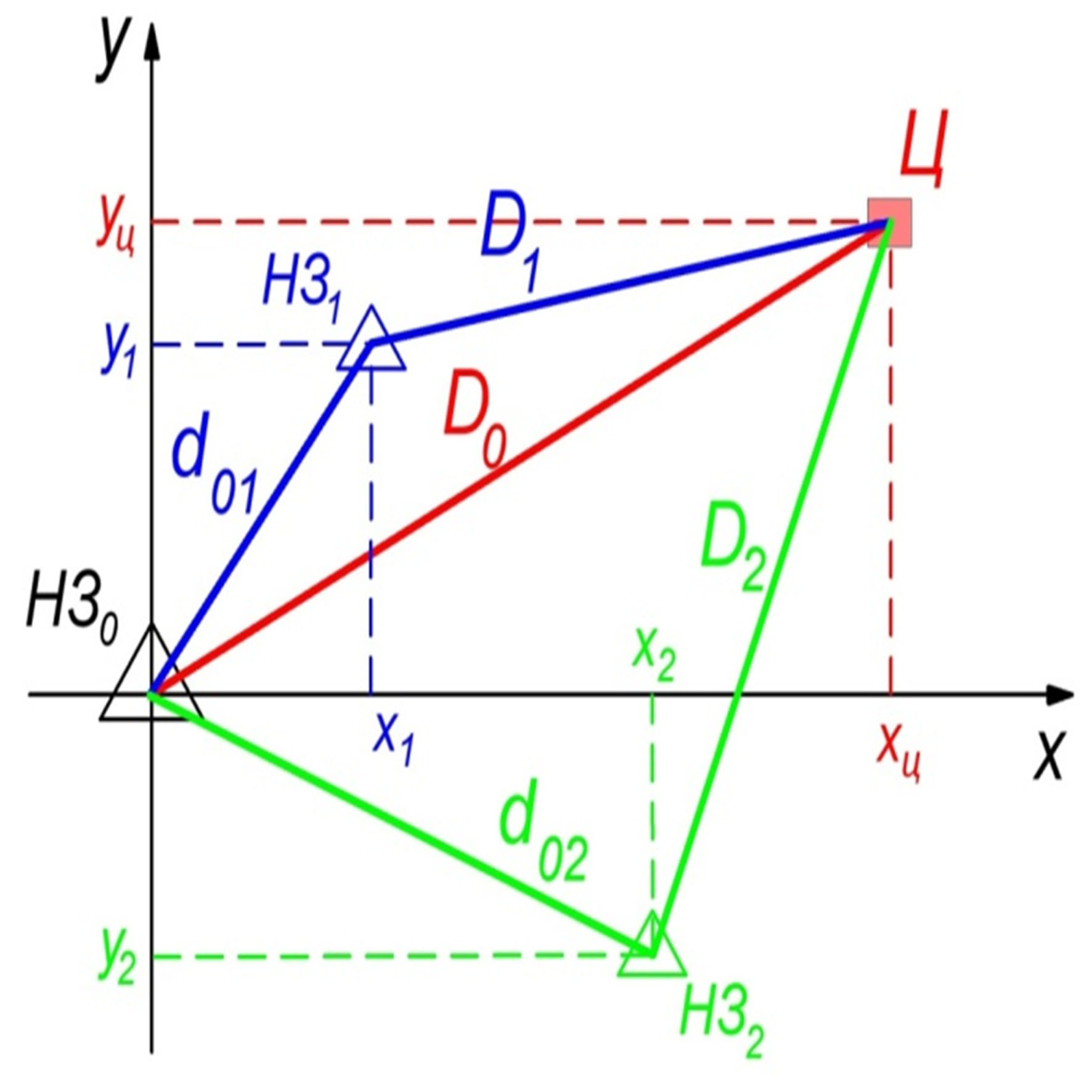 Вычисление местоположения объекта наблюдения (Ц) осуществляется на основе определения координат , при плоскостной задаче, а для позиционирования в пространстве добавляется еще одна координата. Начальными условиями для расчетов выступают известные координаты наземных станций (НЗ1 и НЗ2) , а также разность дальностей на независимых базах . Координаты НЗi () заранее известны c геодезической точностью.