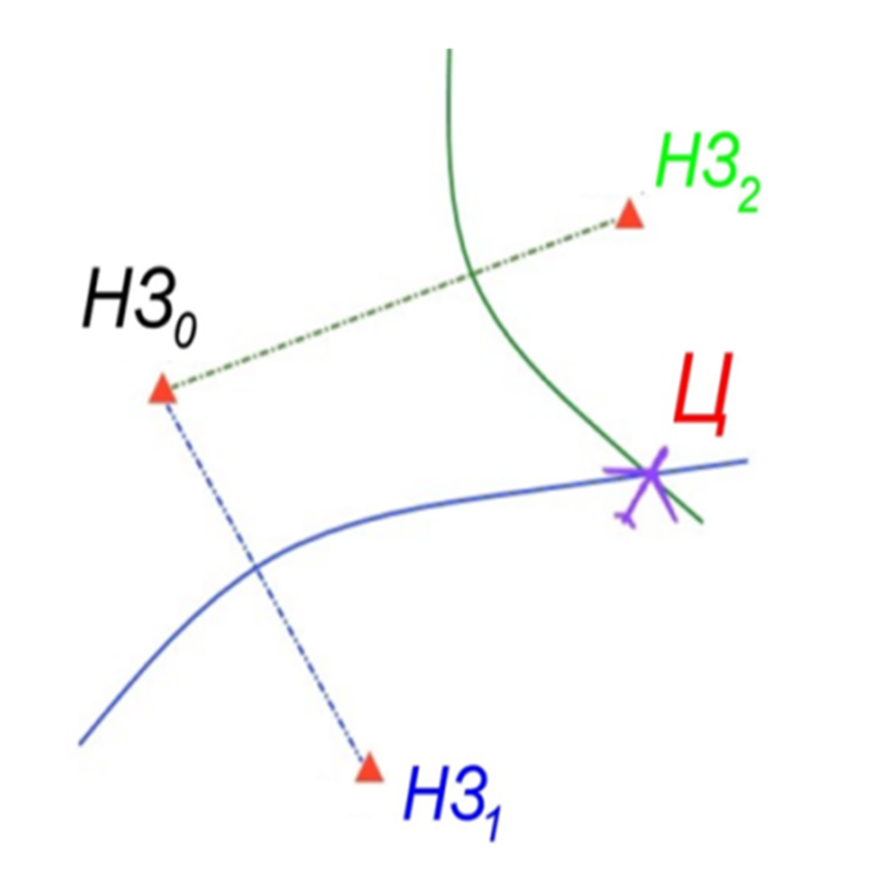 Позиционирование ВС, применяя метод гипербол, позволяет получить местоположение объекта наблюдения (Ц), как точки пересечения гипербол, фокусы которых лежат в месте установки НЗ (рис. 9).