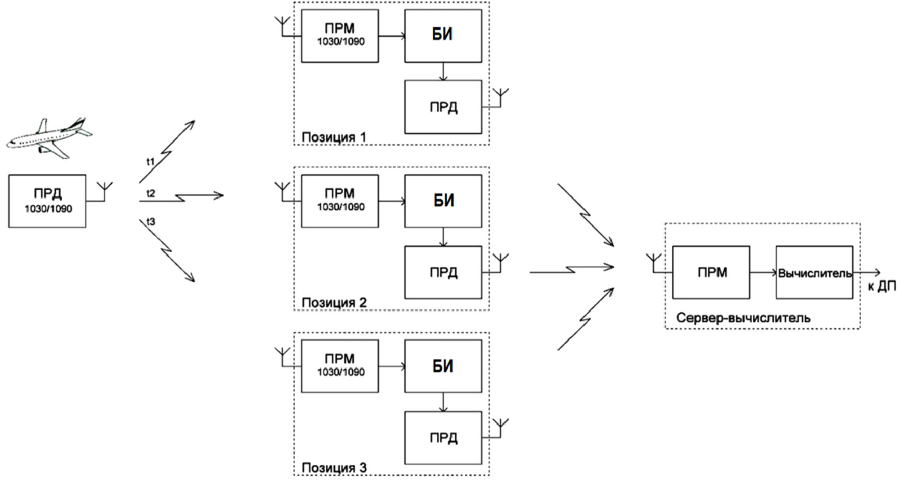 При реализации алгоритма функционирования в аппаратуре МПСН, упрощенная структура системы представлена на рисунке 10. Самолётный ответчик ВС формирует сигнал, который приходит на позиции с разными временными задержками (t1, t2, t3). ПРМ 1030/1090 выполняет стандартные процедуры: избирательности, преобразования частоты, усиления принятых сигналов. Блок измерения (БИ) фиксирует момент прихода сигнала относительно единого времени, установленного на НЗ. Эти сигналы проходят первичную обработку и передаются на сервер-вычислитель, где происходит определение местоположения ВС. Данные о местоположении ВС поступают в центр организации воздушного движения, диспетчерский пункт (ДП) и отображаются на индикаторе.