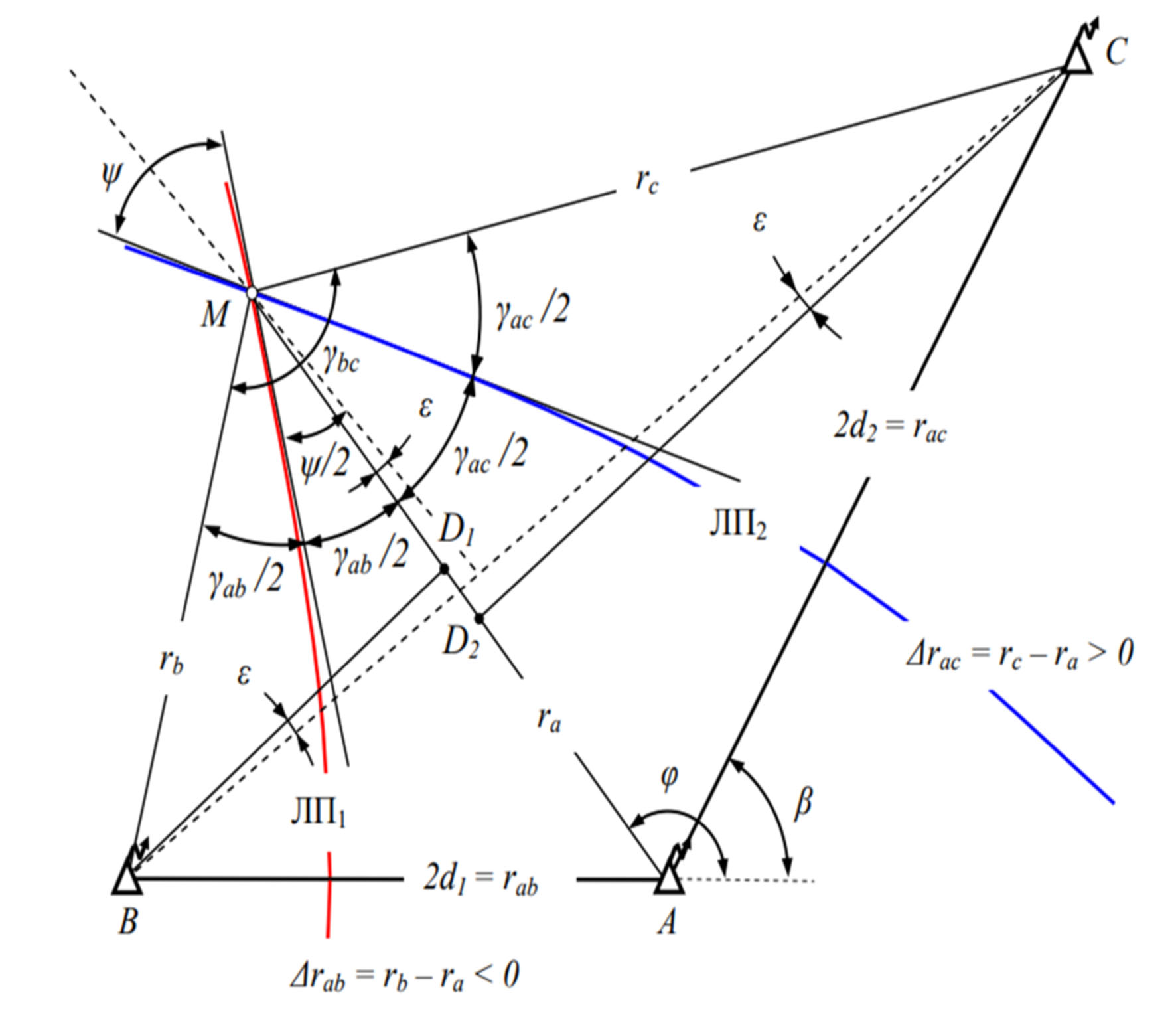 Базы rab и rac каждой из пар радиомаяков «видны» из точки местоположения самолета под углами γab и γac (называемыми также углами визирования или далее базовые углы). При этом касательные в точке пересечения линий положения, задаваемых каждой парой станций, являются биссектрисами базовых углов γab и γac. Поэтому угол пересечения линий положения ЛП1 и ЛП2: