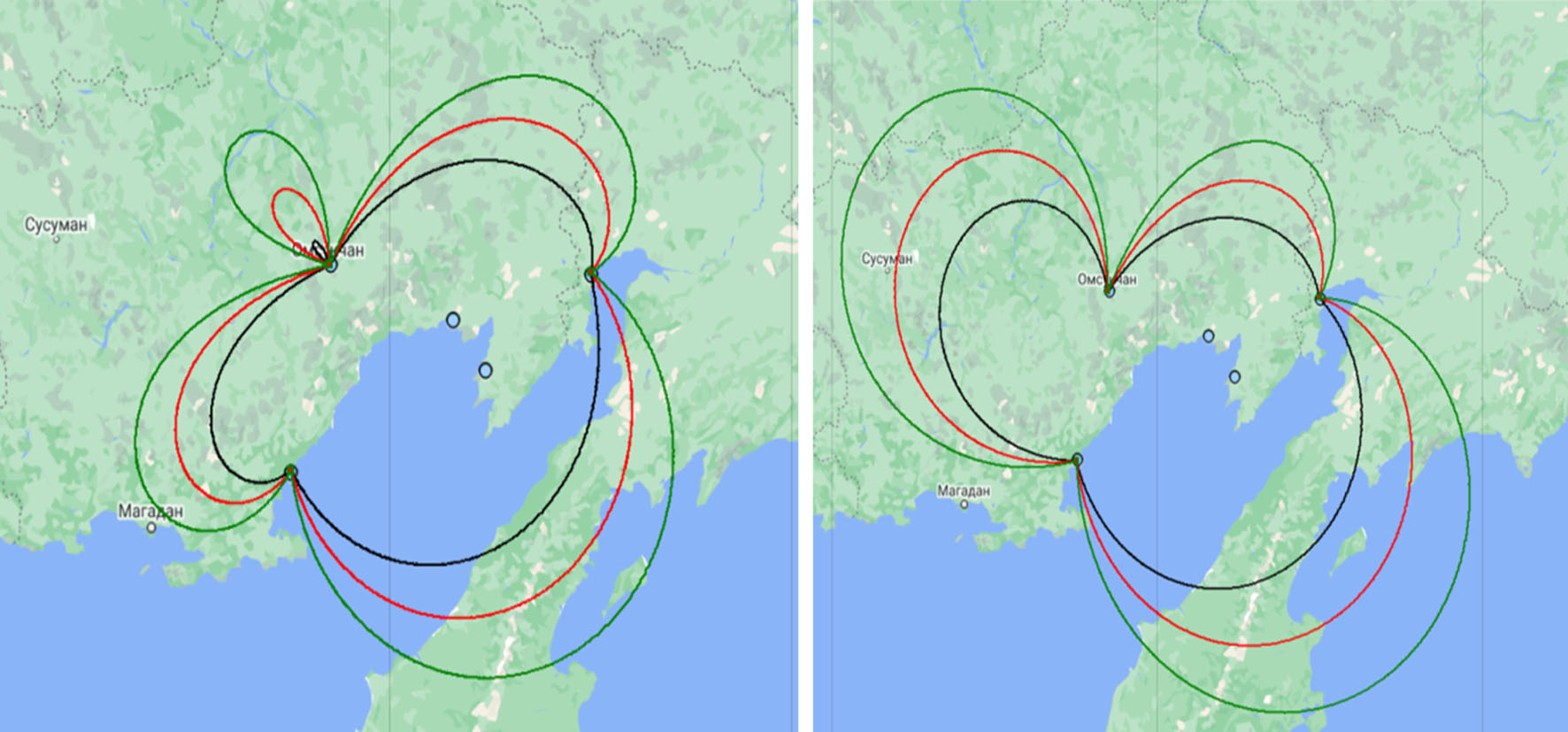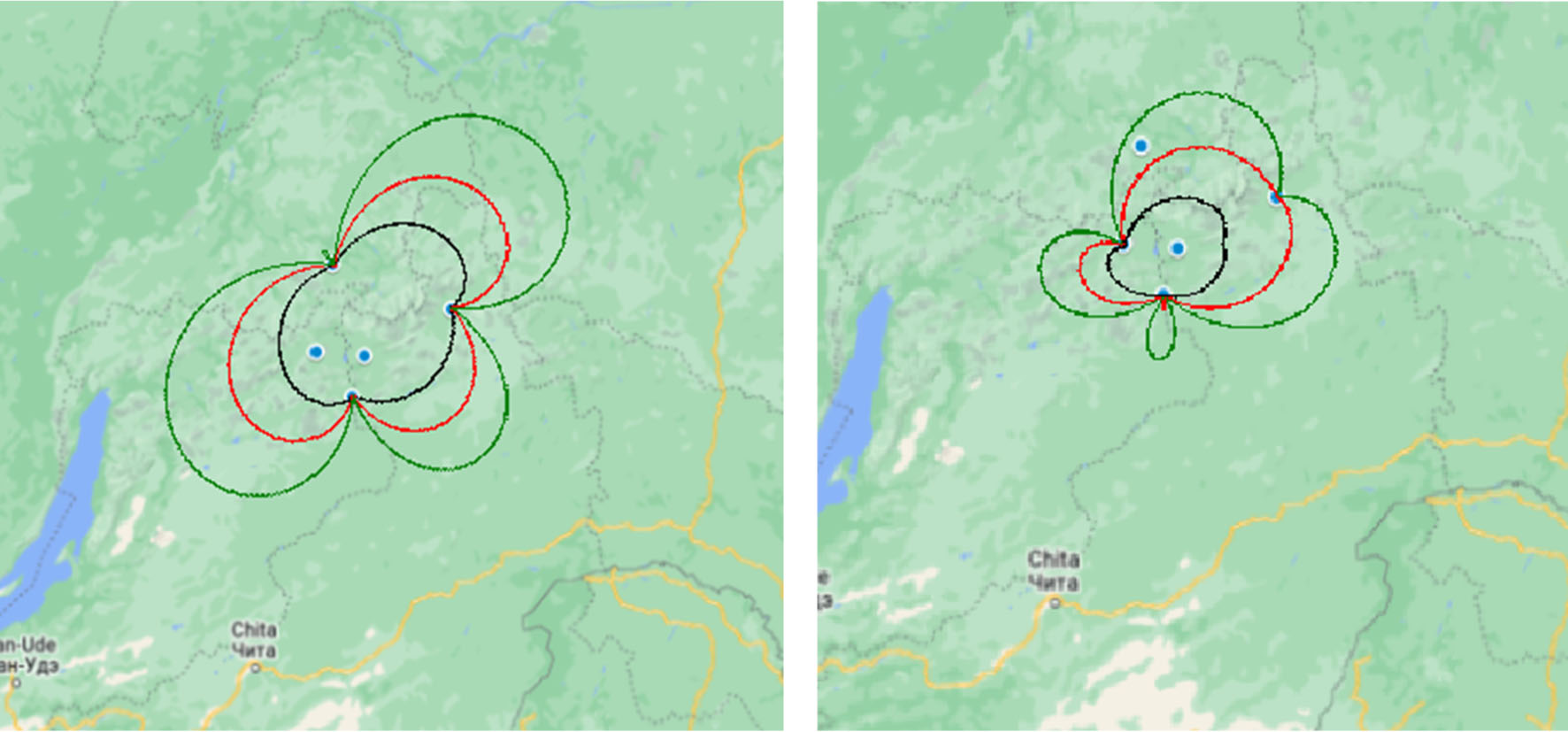 Для предложенного размещения НЗ были построены линии положения, образующие рабочую зону, при начальных условиях требуемой точности: среднеквадратическое отклонение (СКО) измерения временного интервала 10-9 с; СКО радиальной ошибки: 5, 10, 20 метров (чёрный, красный, зелёный – линии соответственно) (рис. 12). Построенная зона для двух пар НЗ позволяет обеспечить качественный прием сигнала от ВС при использовании двух пар станций с заданным качеством ошибок позиционирования.