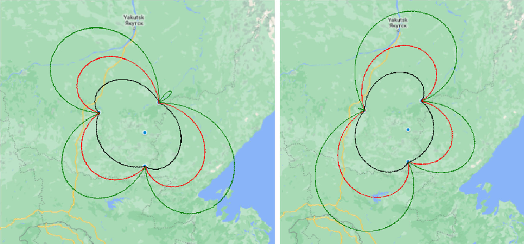 На работоспособность МПСН (точностные характеристики) существенно влияет топология размещения позиций системы, а именно геометрический фактор (места расположения НЗ) и размеры зон покрытия [Using…, 2022]. Расчет данных характеристик производился путем построения зоны видимости системы с учетом дальности установки приемников друг от друга и их количества применительно к трем областям воздушного пространства Российской Федерации, находящимся под управлением региональных центров ОрВД: Иркутским, Нерюнгринским и Магаданским.