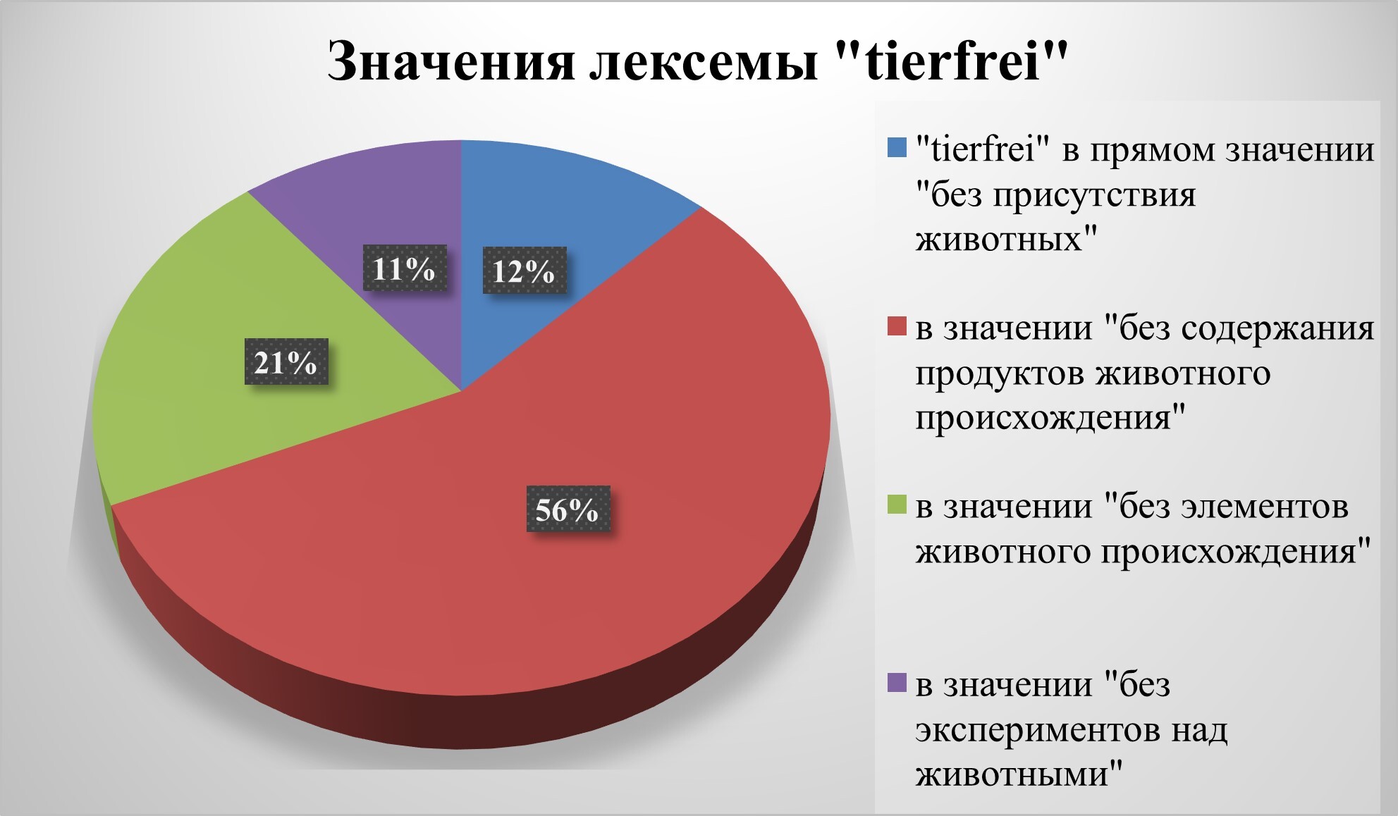 - У лексемы «tierfrei» могут быть выделены четыре основных значения: «без присутствия животных»; «без содержания продуктов животного происхождения»; «без элементов животного происхождения»; «без экспериментов над животными». Каждому из значений соответствуют типичные сочетания. Это преимущественно слова с обобщающей семантикой или слова, которые традиционно ассоциируются с животными.