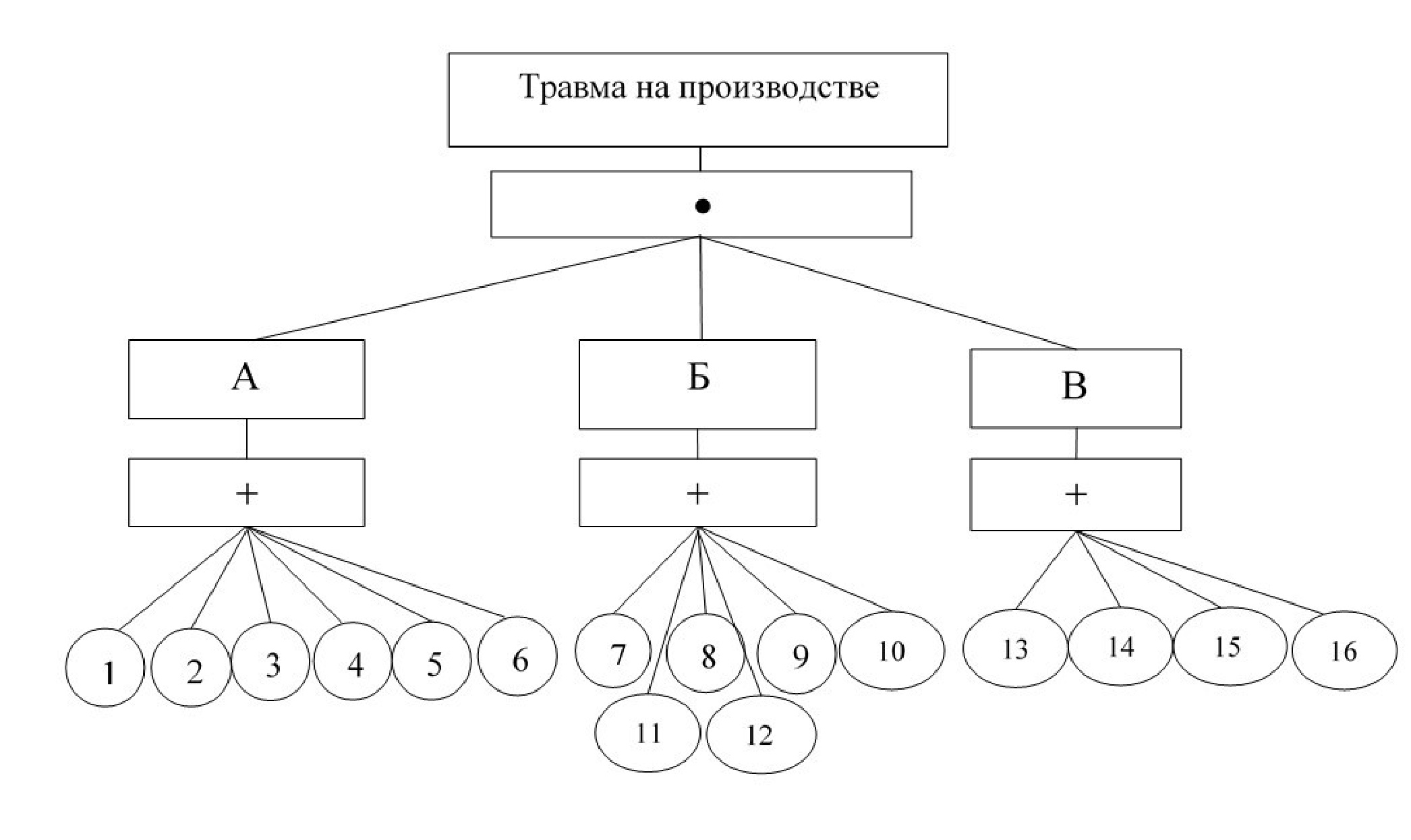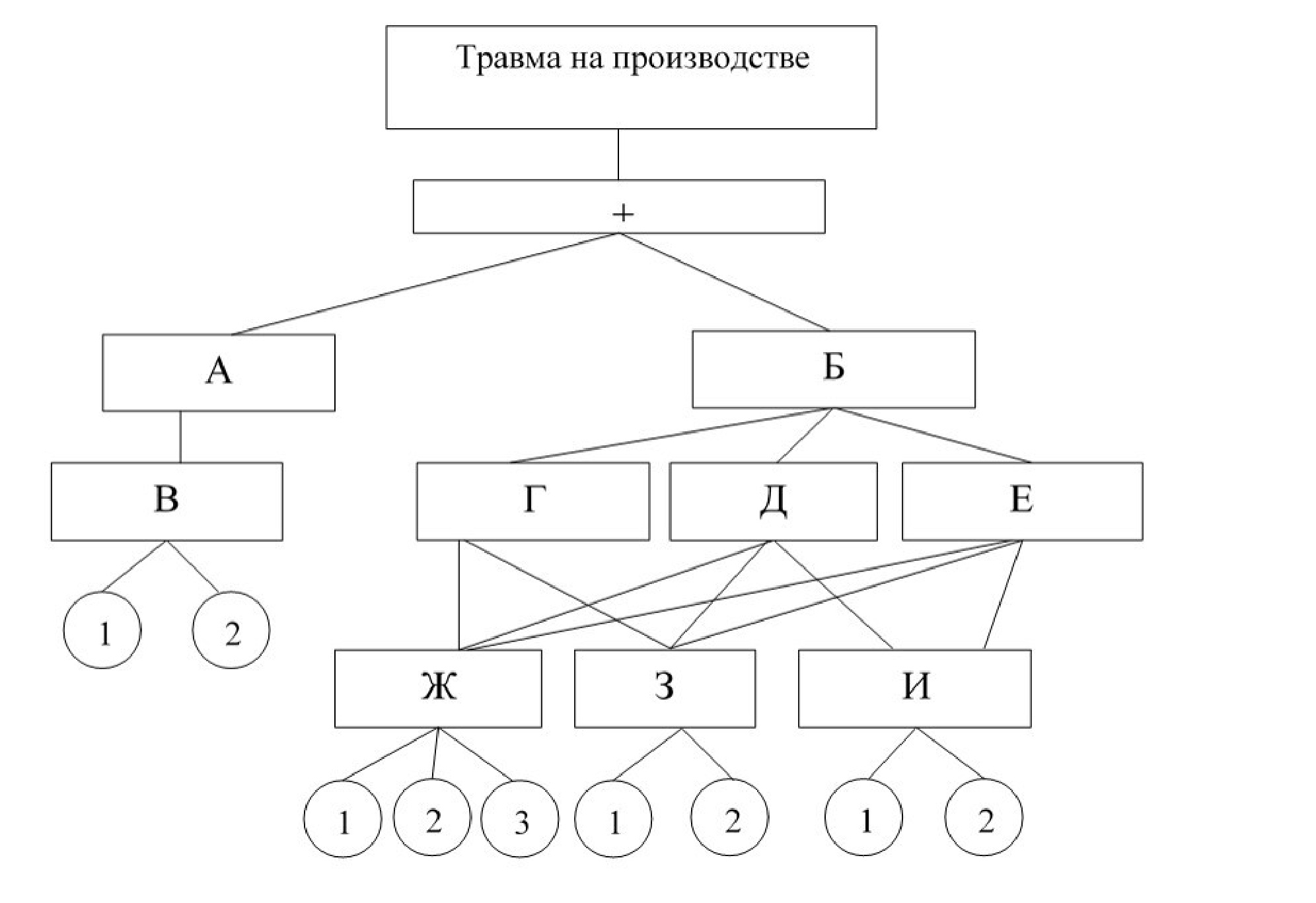 На рисунке 3 основным событием является травма на производстве. Предпосылки и их причинные цепи образуют ветви дерева происшествия, а исходные события, такие как отказы оборудования, ошибки персонала или неблагоприятные внешние факторы, выступают в роли листьев.