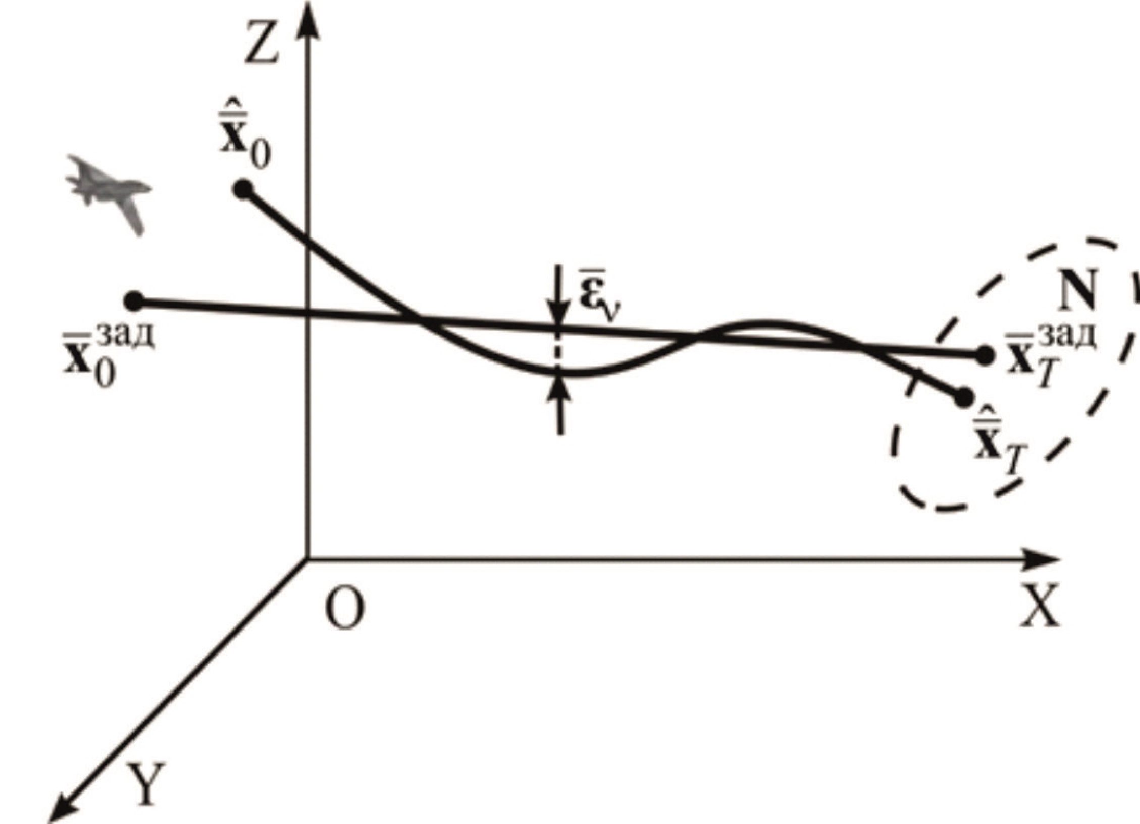 Для выдерживания заданного маршрута полета требуется формирование управляющих сигналов uv отслеживания заданной траектории полета xЗ, v наилучшим образом. В работе показатель качества выдерживания маршрута полета представлен в виде минимизации отклонения управляемой траектории относительно заданной [Ерохин, 2019; Ерохин, 2018; Меркулов и др., 2018; Харисов и др., 1996]: