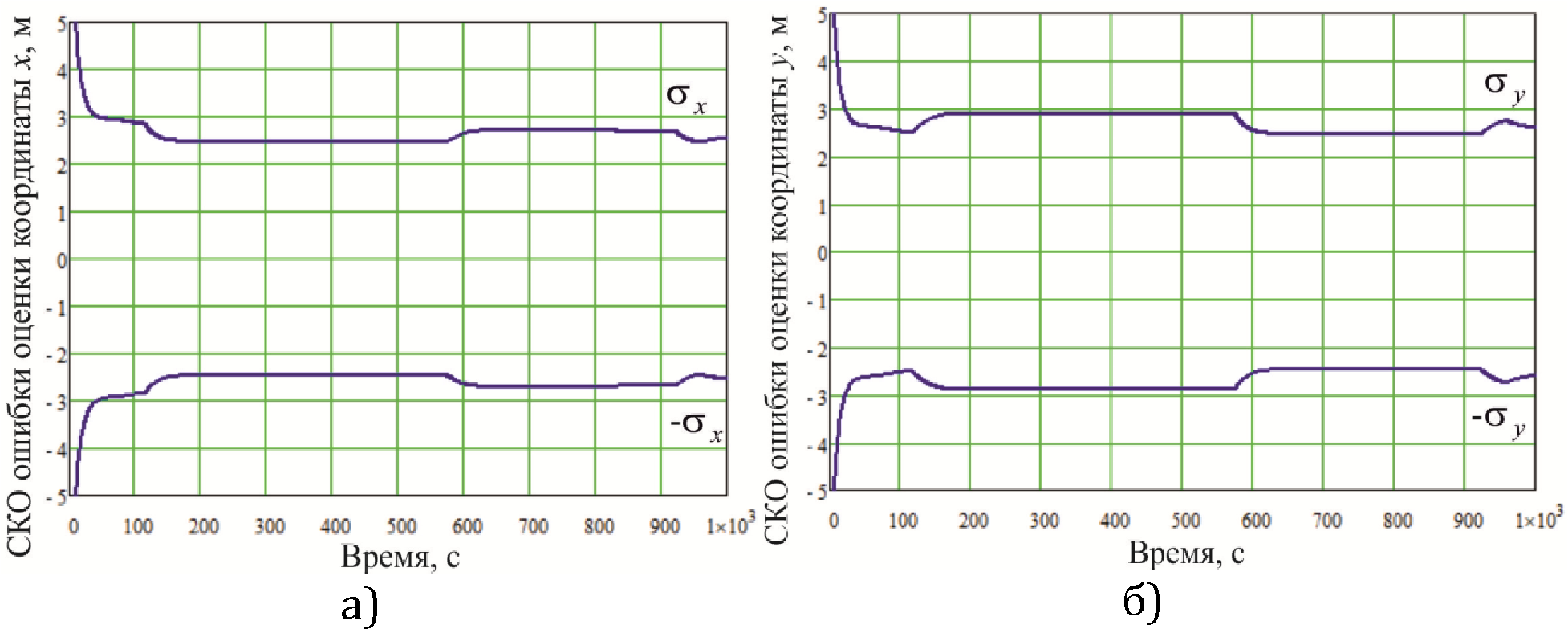 На рисунке 4 представлены графики среднеквадратического отклонения оценки (СКО) σx и σy ошибки оценки координат ВС.