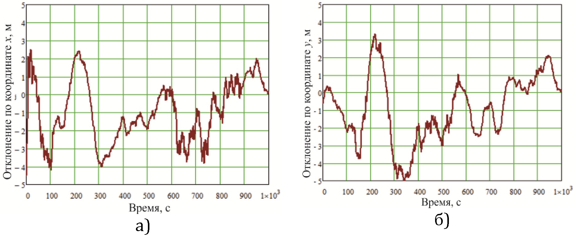 Рисунок 5 – Отклонение текущих координат ВС х (a) и y (б) от заданных
