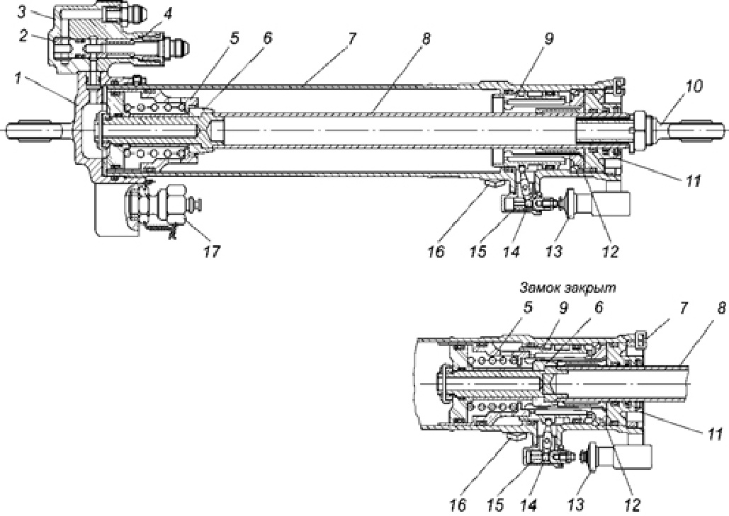 1. Крышка; 2. Поршень с цангой; 3. Клапан аварийный; 4. Упор; 5. Поршень запирающий; 6. Втулка упорная; 7. Корпус; 8. Шток; 9. Поршень плавающий; 10. Болт ушковый; 11. Букса; 12. Цанга; 13. Выключатель концевой; 14. Рычаг; 15. Толкатель; 16. Штуцер уборки; 17. Переходник