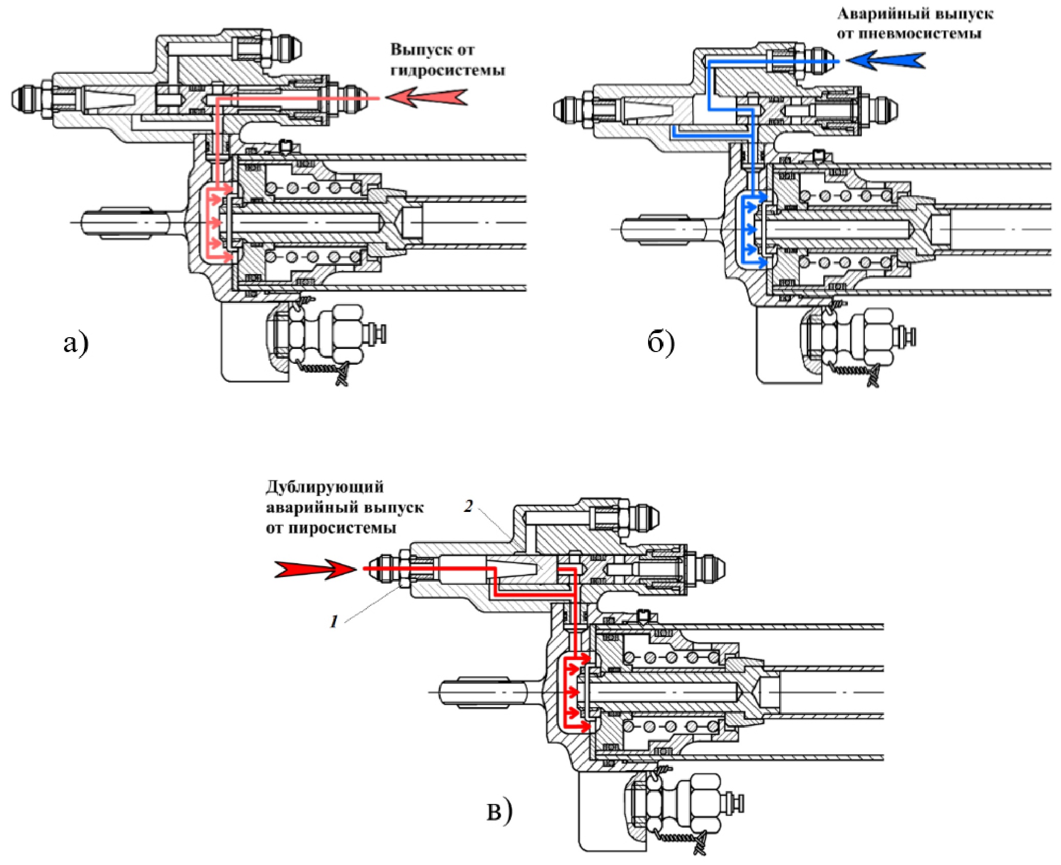 Для демонстрации авторской разработки на рисунке 3а показана схема работы цилиндра выпуска основной опоры от гидросистемы, 3б – от аварийной пневмосистемы, 3в – от дублирующей аварийной пиросистемы.