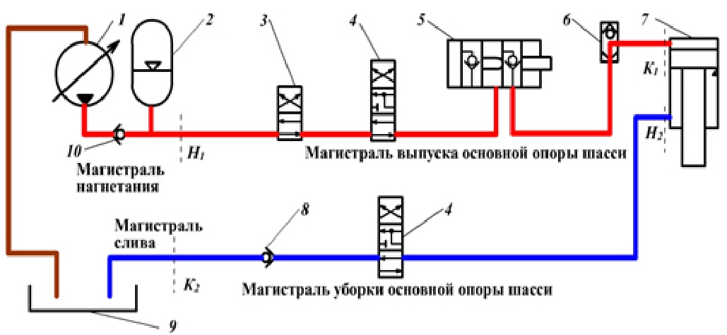 1. Гидронасос; 2. Гидроаккумулятор; 3. Двухпозиционный электрогидрораспределитель; 4. Трехпозиционный электрогидрораспределитель; 5. Цилиндр замка убранного положения шасси; 6. Цилиндр уборки и выпуска шасси; 8, 10. Обратный клапан; 7. Гидроцилиндр уборки-выпуска шасси; 9. Гидробак