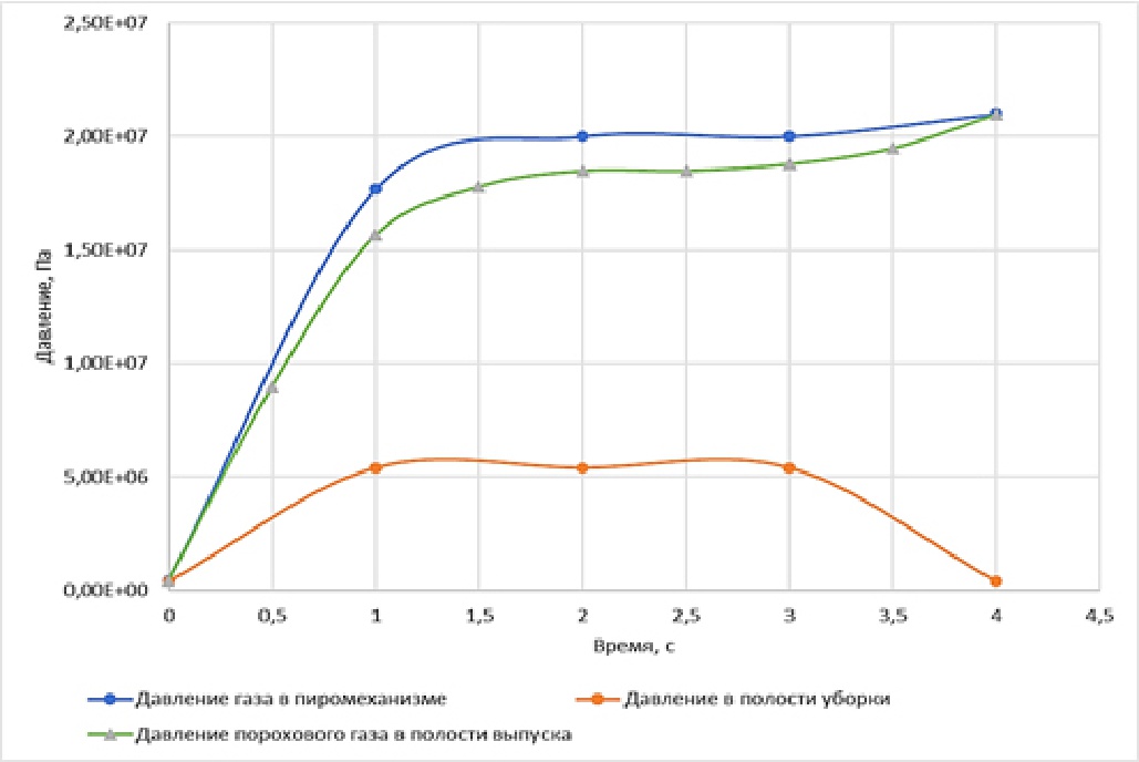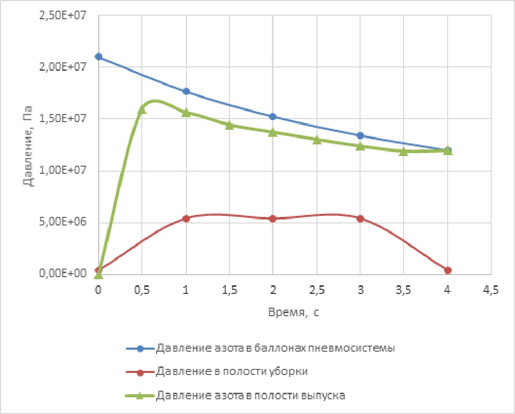 Таким образом, можно сделать вывод, что предложенная модель с использованием пороховых газов для обеспечения работы цилиндров может быть рекомендована как один из вариантов дублирующей аварийной системы выпуска шасси.
