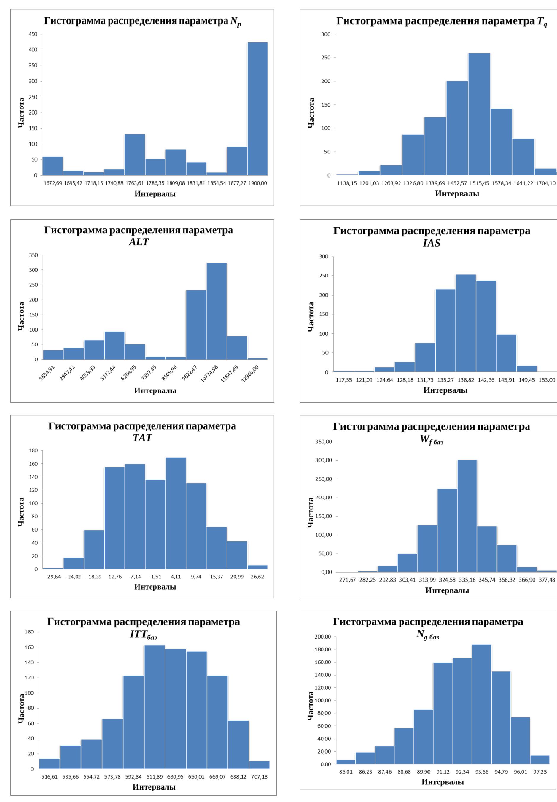 Первичная обработка статистических данных. Ввиду того, что сервис Camp позволял выгрузить значения параметров за длительный период эксплуатации двигателя, статистика по Δ-значениям (отклонениям) параметров, независимым параметрам ALT, OAT, IAS, Np, Tq и измеренным параметрам , и – собрана в достаточном объеме. Для параметров ITT и Ng массивы статистических данных созданы на основании 948 измерений в период с июля 2017 по октябрь 2021 по Х бортам конкретной авиакомпании. Для параметра Wf имеются данные по 942 измерениям за тот же период.