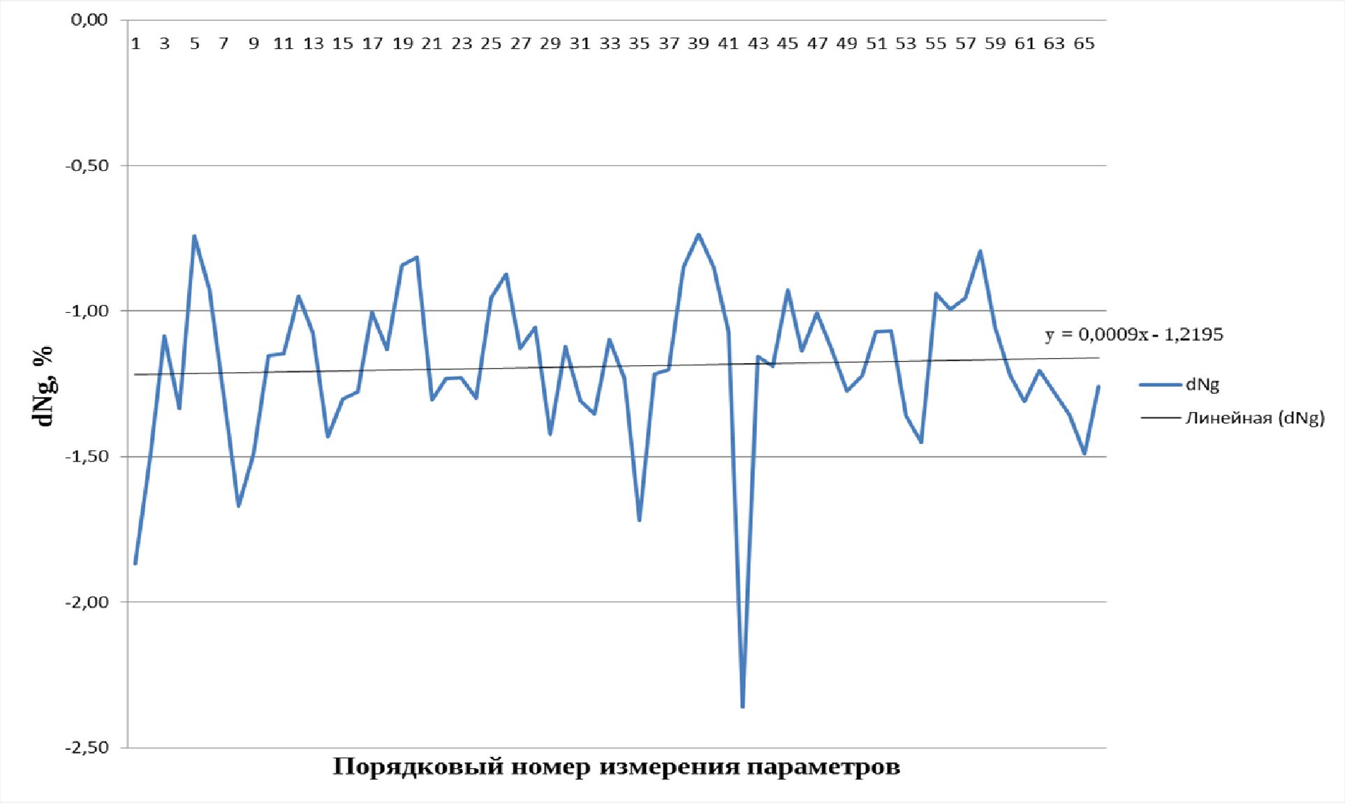 На рисунке 5 представлен график изменения отклонения параметра ΔNg в соответствии с порядковым номером измерения. Коэффициент, характеризующий наклон аппроксимирующей прямой оборотов турбокомпрессора к оси абсцисс, имеет близкое к нулю значение. Разность между измеренным и базовым значениями практически не меняется.