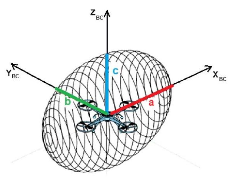 Размеры ВЗО характеризуются длиной большой полуоси a эллипсоида, совпадающей с продольной осью (вектором воздушной скорости) ВС, длиной средней полуоси b (при b>c), лежащей в горизонтальной плоскости ВС, и длиной малой полуоси с, нормальной горизонтальной плоскости ВС. Ориентация ВЗО в пространстве определяется углами крена, тангажа и курса ВС.
