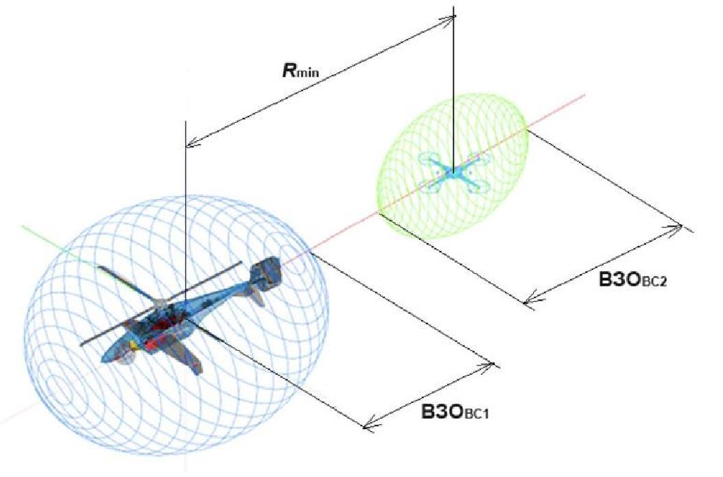 При решении задачи предупреждения и разрешения конфликтных ситуаций на всех уровнях рассматривается минимальное безопасное расстояние Rmin между ВС (рис. 3).