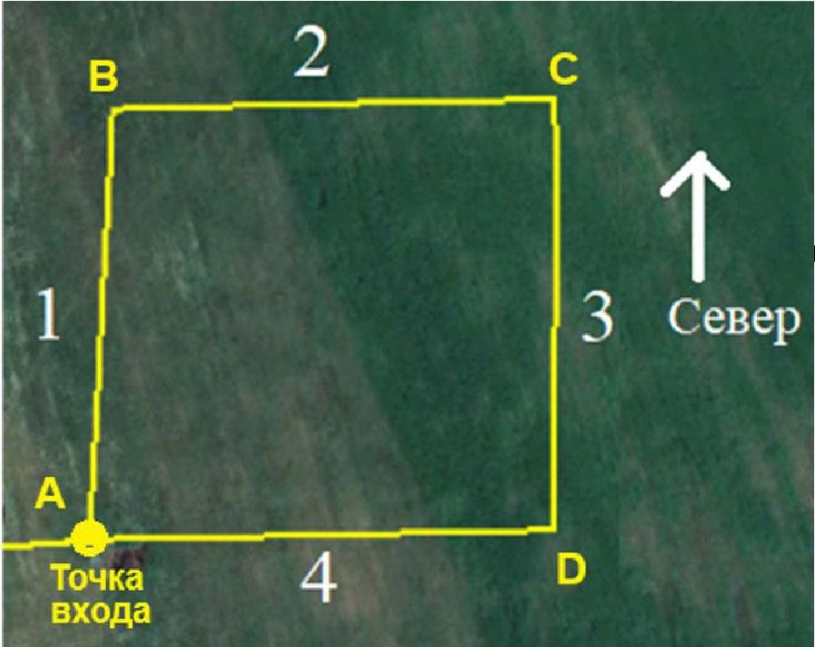 Для проведения эксперимента задавался полет БВС по маршруту, показанному на рис. 4, представляющему собой квадрат со стороной 200 м. Стороны квадрата 1 и 3 ориентированы в направлении север-юг, стороны 2 и 4 – запад-восток, что позволяет оценивать погрешность бокового отклонения (выдерживания) БВС от заданной траектории по одной из горизонтальных координат (широте или долготе). На участках 1 и 3 полет осуществляется с курсами 0° и 180°, на участках 2 и 4 – с курсами 90° и 270° соответственно.