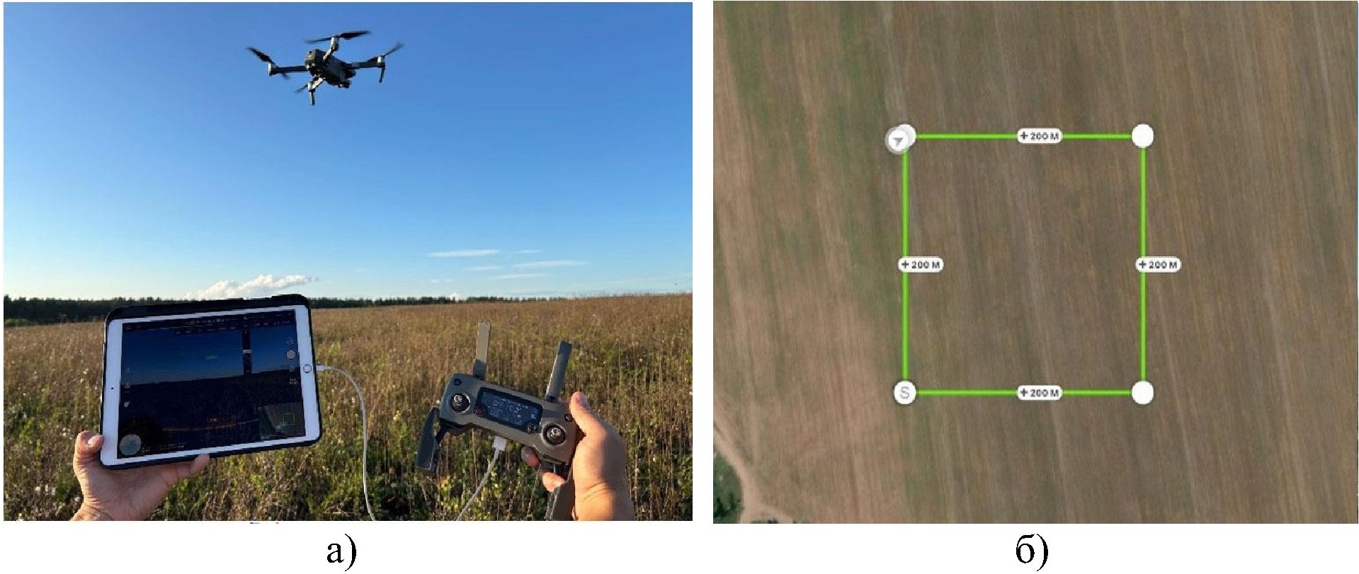 Для построения заданной траектории использовалось приложение DJI Ground Station Pro (DJI GS PRO), которое устанавливается на планшетные компьютеры фирмы Apple. В документации производителя не указывается точность вычисления заданной траектории, однако для программирования полета на расстояния порядка 200 м данную погрешность можно считать несущественной по сравнению с погрешностью позиционирования. Далее планшет подключался к пульту управления БВС, как показано на рис. 6, а. В приложении есть возможность создания и редактирования координат опорных точек заданной траектории, что позволило сформировать заданную траекторию в виде квадрата 200х200 метров.