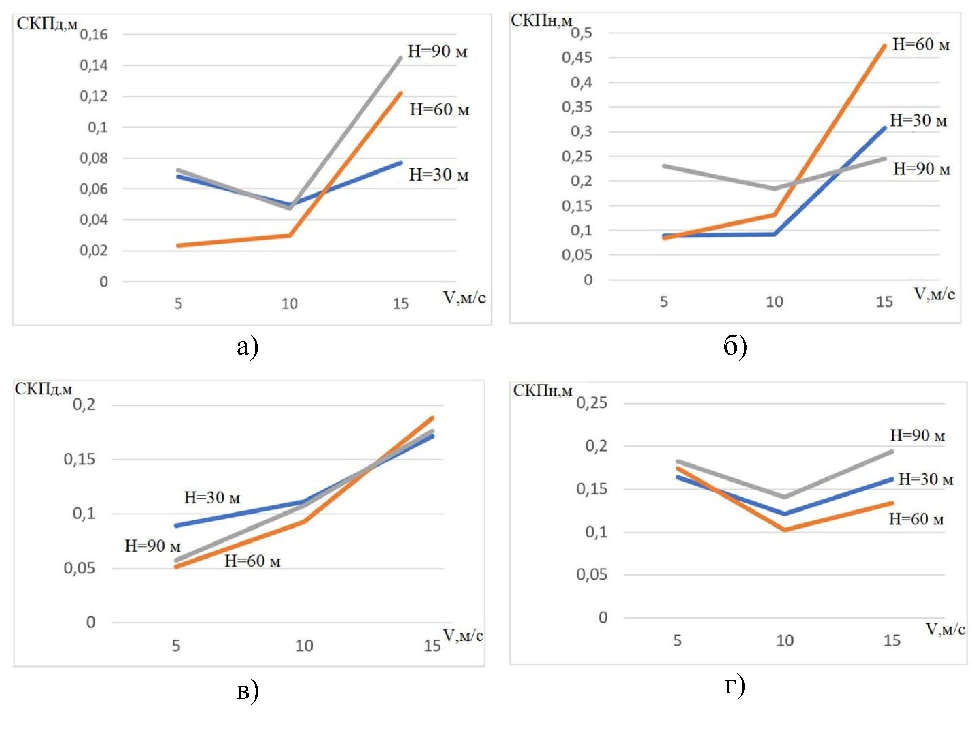 Рисунок 8 – Зависимость СКП измерения координат от скорости полета БВС: а) СКПШ широты, участок 2; б) СКПН высоты, участок 2; в) СКПШ широты, участок 4; г) СКПН высоты, участок 4