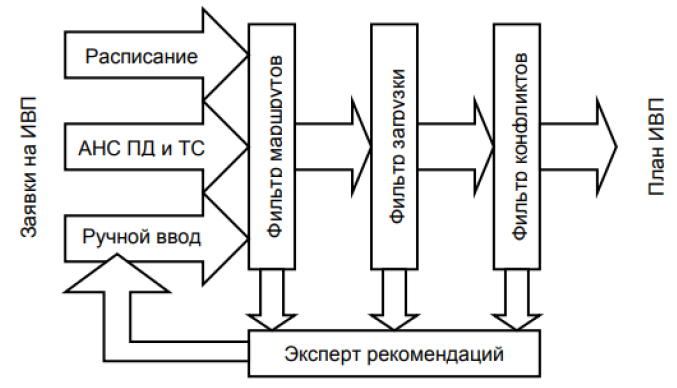 Экспертная модель может состоять из последовательно-соединенных блоков маршрутов, загрузки и конфликтов, а также блока поддержки принятия решений при оптимизации плана полетов. Все три блока выполняют роли фильтров и сужают множество допустимых плановых траекторий, используя заданную систему правил и информационный образ воздушной обстановки. Первый – выбирает траектории, проходящие по маршрутам с длиной пути не более максимально допустимой. Второй сужает множество допустимых плановых траекторий с учетом загрузки секторов воздушного пространства, третий – по данным о конфликтах траекторий. На основе информационного образа и базы знаний эксперт рекомендаций формирует диспетчеру рекомендации по планированию воздушного движения.