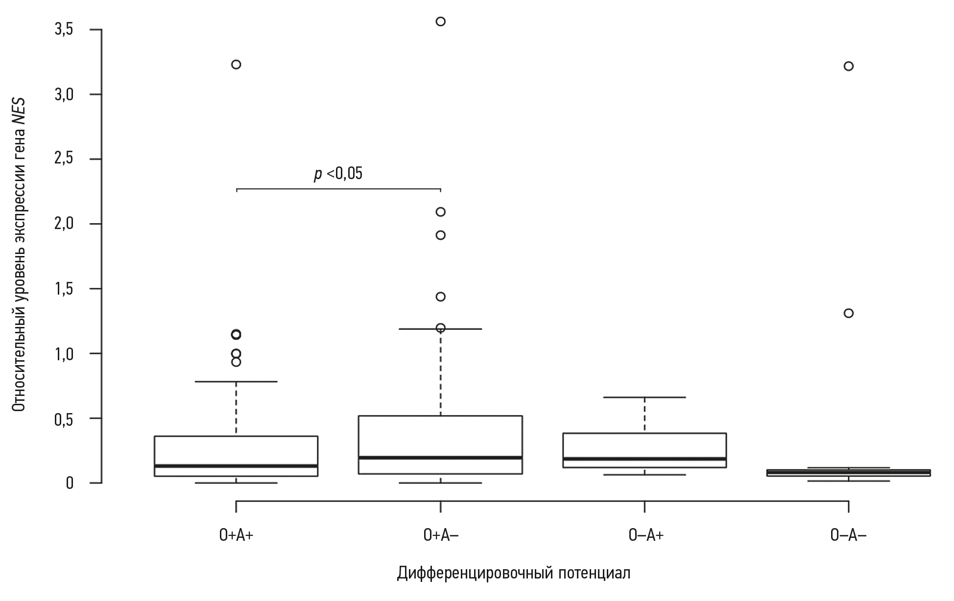 Индивидуальные клоны КОЕф проанализированы по способности к дифференцировке в жировом и костном направлениях. В итоге все 296 проанализированных клонов были сгруппированы в 4 субпопуляции: 50% всех клонов способны к дифференцировке и в остеогенном, и в адипогенном направлении (О+А+); 43% клонов способны к остеогенной, но не к адипогенной дифференцировке (О+А–); всего 3% клонов способны к адипогенной, но не к остеогенной дифференцировке (О–А+); 4% составили клоны, не способные к данным дифференцировкам (О–А–). При анализе экспрессии нестина в клетках индивидуальных клонов КОЕф, различающихся по дифференцировочному потенциалу, наивысший ОУЭ этого гена был выявлен в группе монопотентных остеогенных предшественников (О+А–), тогда как в бипотентных предшественниках (О+А+) его экспрессия была статистически значимо ниже (рис. 2).