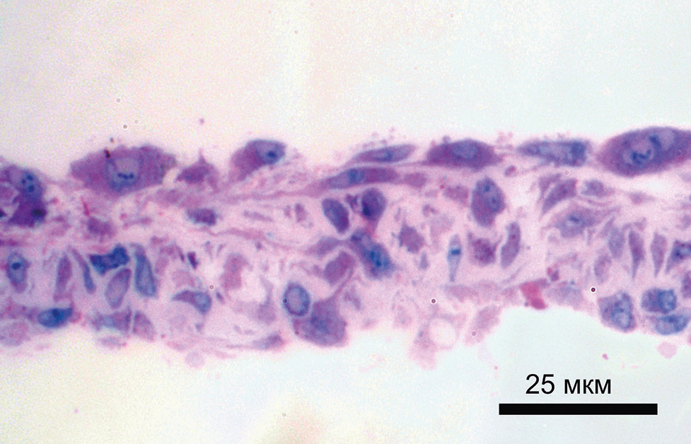 При культивировании на мембране ThinCert визуализация клеток в фазовом контрасте была затруднена из-за конструкции вкладки, содержащей множественные поры. С помощью флуоресцентной микроскопии удалось оценить взаиморасположение клеток: оно было менее равномерным, чем при других вариантах культивирования, с тенденцией к скоплению по краям лунки. Вероятно, этому способствовал «краевой эффект» мениска жидкости. Изготовление срезов при таком варианте культивирования было возможно без снятия пласта с носителя и позволило констатировать, что данная схема позволяет получить клеточный пласт толщиной около 10 мкм (по результатам гистологии и сканирующей электронной микроскопии (рис. 4), однако такую схему мы посчитали неоптимальной для оценки биомеханических свойств конструкции из-за её неоднородности.