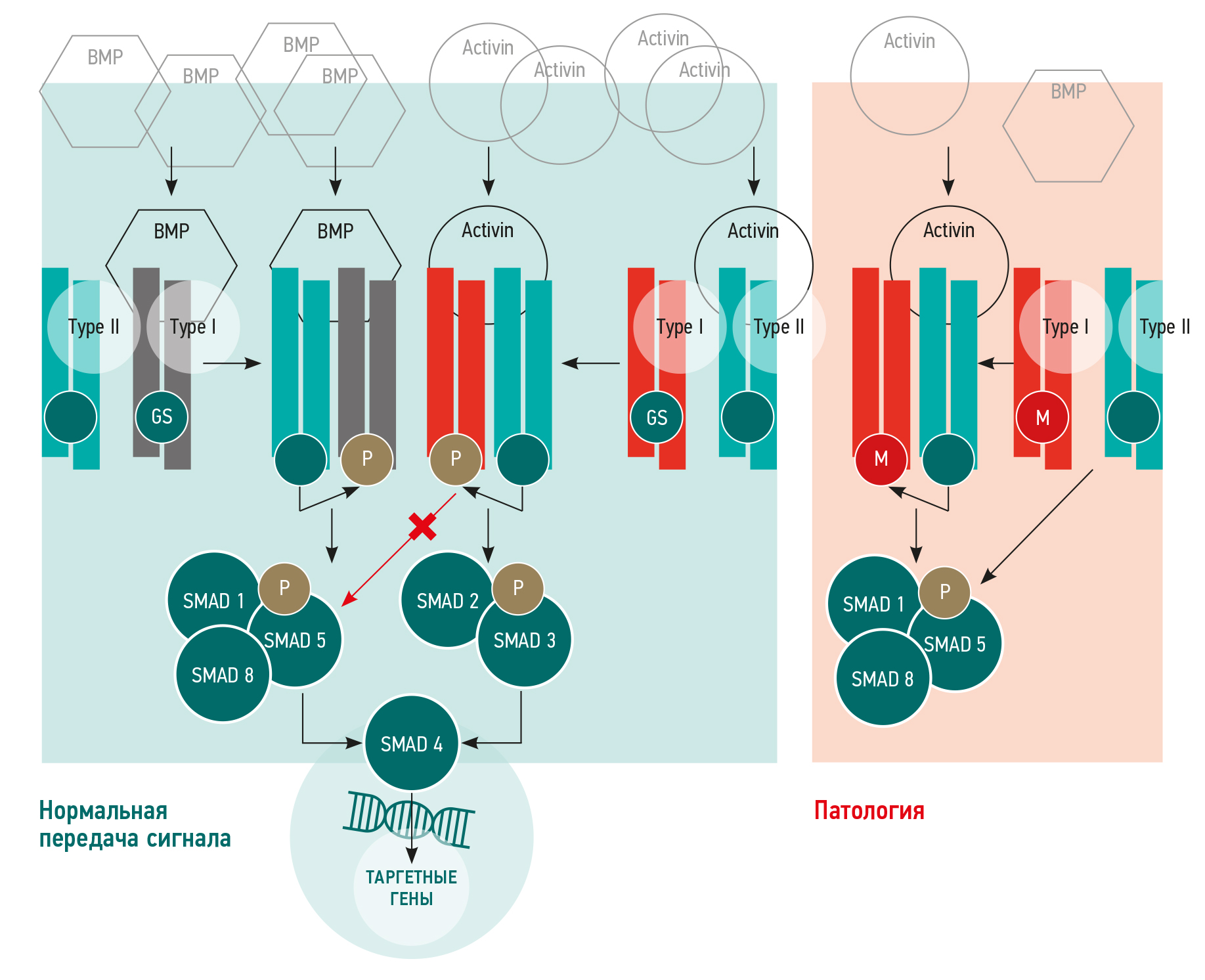 Рис. 1. Схема функционирования ACVR1. Слева — тетрагетеромерный мембранный рецепторный комплекс в норме: ACVR1 образует комплексы гетеротетрамерных рецепторов с рецепторами типа II (AMHR2, ACVR2A или ACVR2B); конкурентное связывание рецептора с активином А подавляет передачу сигналов SMAD1/5/8, смещая внутриклеточный сигналинг в сторону активации SMAD2/3. Справа — функционирование рецепторного комплекса с ACVR1mut, при котором происходит повышение активации внутриклеточного сигнального пути SMAD1/5/8 за счёт постоянного фосфорилирования его внутриклеточных частей и потери способности к конкурентному ингибированию BMP-сигналинга при связывании с активином А.