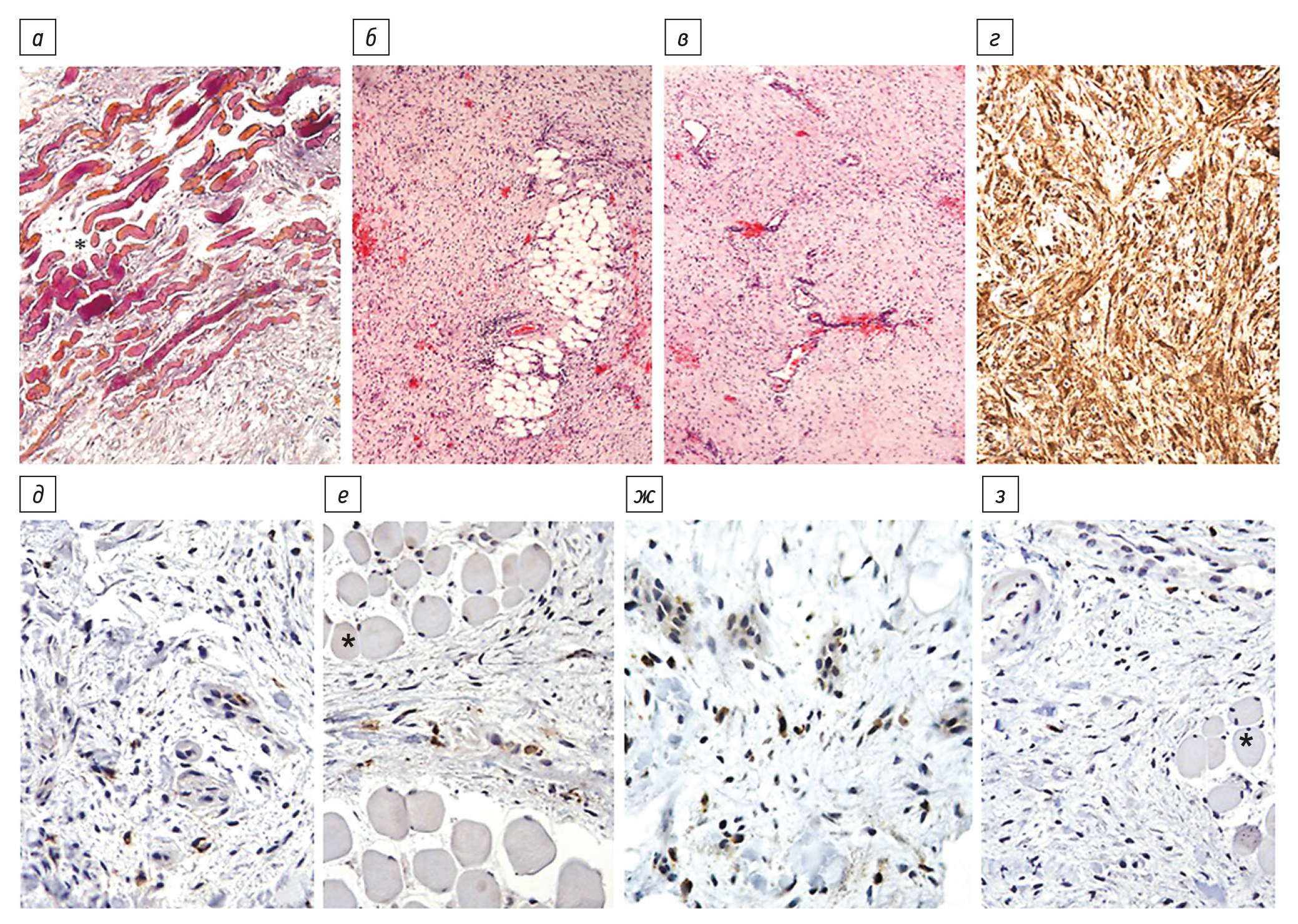 Рис. 2. Строение тканей в очагах «вспышек»: а — некроз мышечной ткани; б — гиперклеточная волокнистая соединительная ткань с участками липоматоза и полнокровными кровеносными сосудами; в — богато васкуляризированная гиперклеточная соединительная ткань; г — миофибробласты и лейомиоциты в реактивно изменённой соединительной ткани; д — клетки CD45; е, ж — клетки CD68; з — клетки CD3. * мышечные волокна. Окраска: а — по Маллори; б, в — гематоксилин и эозин; г, д — иммуногистохимические реакции, продукт окрашен диаминобензидином в коричневый цвет. Ув.: а–в ×100; г–з ×200.