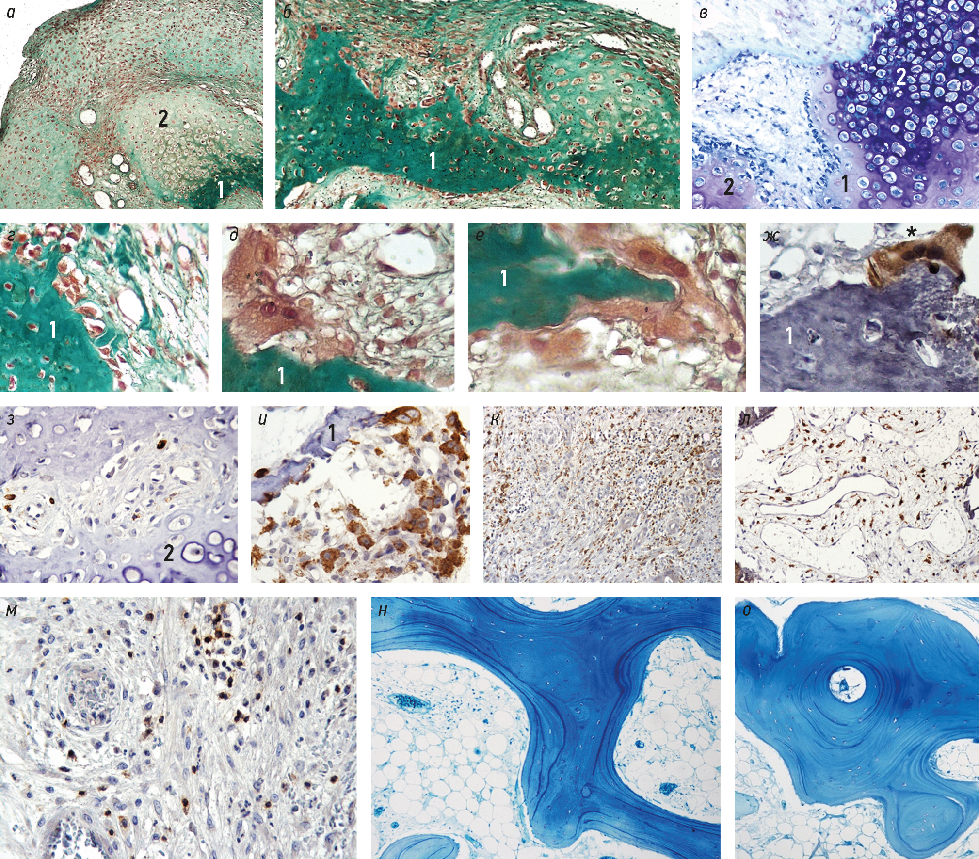 Рис. 3. Строение гетеротопических оссификатов при ФОП: а–в — костно-хрящевые балки; г — активные остеобласты, строящие ретикулофиброзную костную ткань; д, е — остеокласты, резорбирующие костные трабекулы; ж — CAII-положительная гигантская многоядерная клетка на поверхности костной трабекулы (*); з — клетки CD68 в периваскулярной соединительной ткани вблизи хрящевой части гетеротопических оссификатов; и — CD68-положительные гигантские многоядерные клетки; к — клетки CD68 в реактивно изменённой соединительной ткани; л — клетки CD163 в межбалочном пространстве гетеротопических оссификатов; м — клетки CD3 в реактивно изменённой соединительной ткани; н, о — пластинчатая костная ткань гетеротопических оссификатов. 1 — ретикулофиброзная костная ткань; 2 — гиалиноподобная хрящевая ткань. Окраска: а, б, г–е — по Массону; ж–м — иммуногистохимические реакции, продукт окрашен диаминобензидином в коричневый цвет; н, о — толуидиновый синий. Ув.: а, к, л — ×100; б, в, г, з, и, н, м, о — ×200; д–ж — ×400.