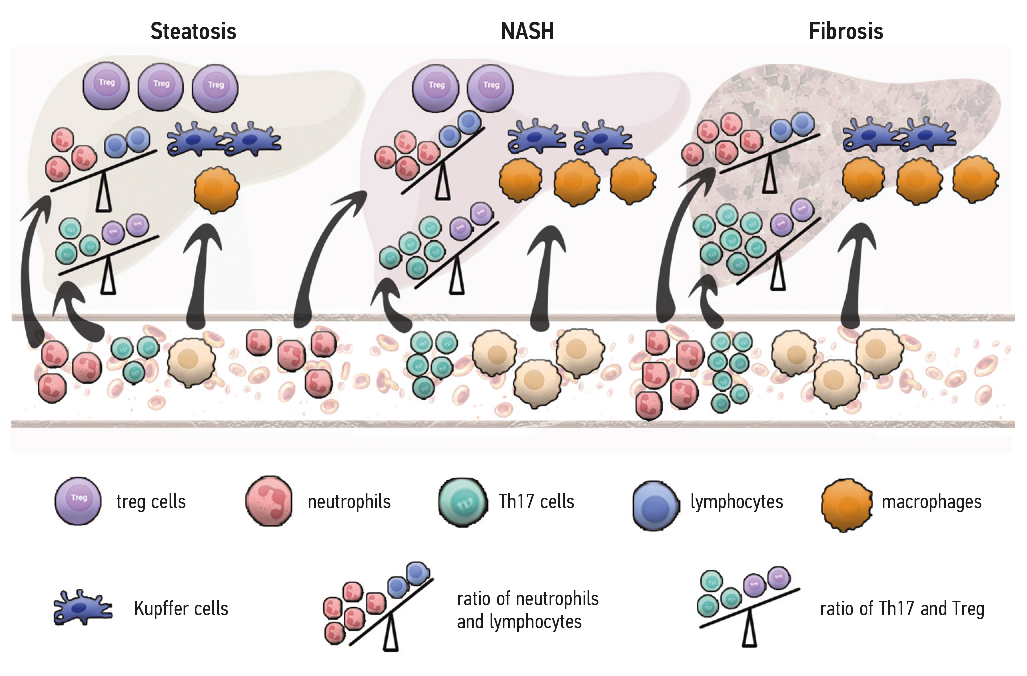 Количество печёночных Treg-клеток снижается по мере развития стеатоза и ещё больше — по мере того, как стеатоз развивается в неалкогольный стеатогепатит (НАСГ). Прогрессирование заболевания сопровождается истощением пула Тreg в печени. Риск развития НАСГ и фиброза у пациентов с НАЖБП возрастает по мере увеличения соотношения нейтрофилов/лимфоцитов в печени. Наличие нейтрофилов в портальных инфильтратах коррелирует с прогрессированием НАЖБП. Иммунный гомеостаз поддерживается балансом между клетками Treg и Th17. Увеличение числа Th17 может способствовать стеатозу и воспалению печени при НАЖБП и ускорять переход от простого стеатоза к стеатогепатиту. Оценка повреждения печени, степень фиброза печени и экспрессия маркёров воспаления выше у пациентов с более высоким соотношением Th17/Treg. При НАСГ повреждение печени, вызванное избытком липидов и повреждением/гибелью гепатоцитов, запускает активацию резидентных клеток Купфера с последующей секрецией провоспалительных цитокинов и хемокинов и усиленным рекрутированием моноцитов из кровотока. По мере прогрессирования НАСГ моноцитарная часть макрофагов постепенно начинает преобладать над пулом резидентных макрофагов.